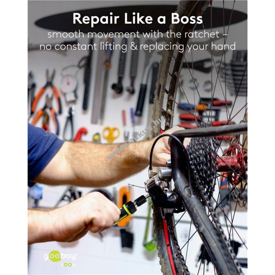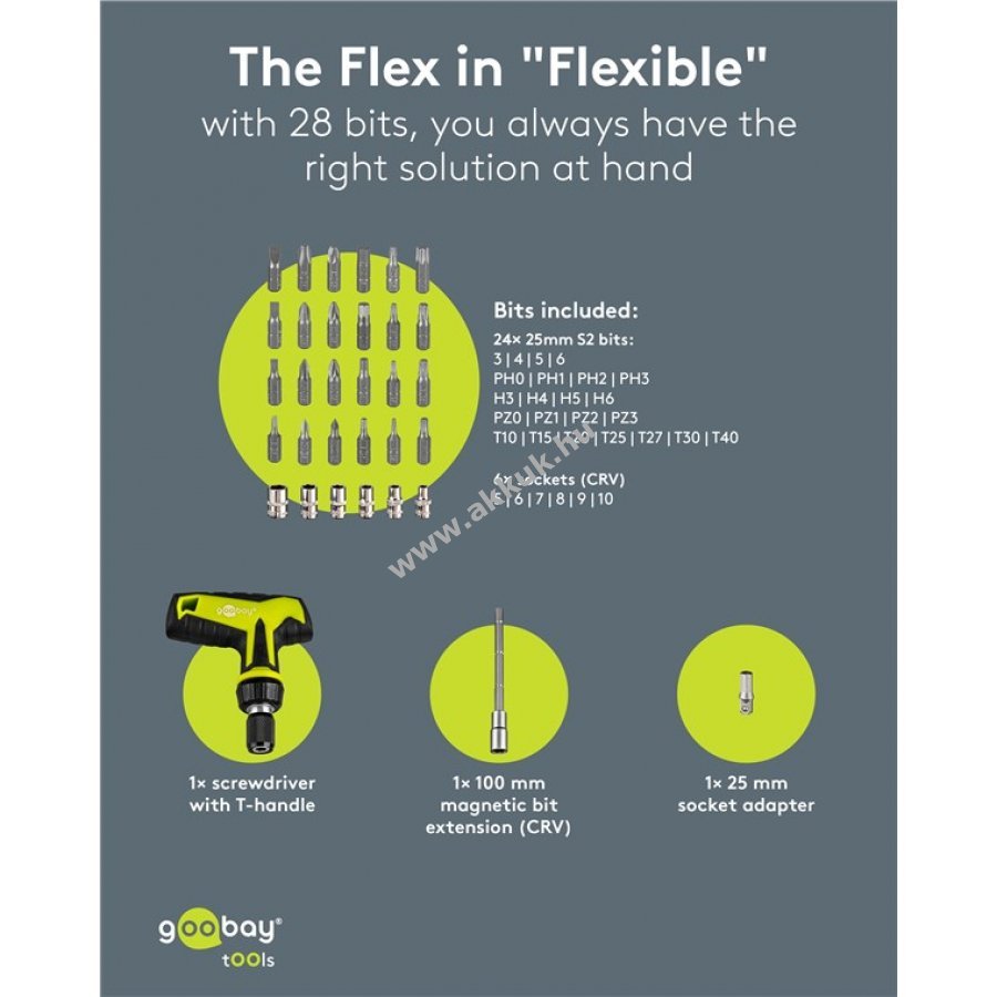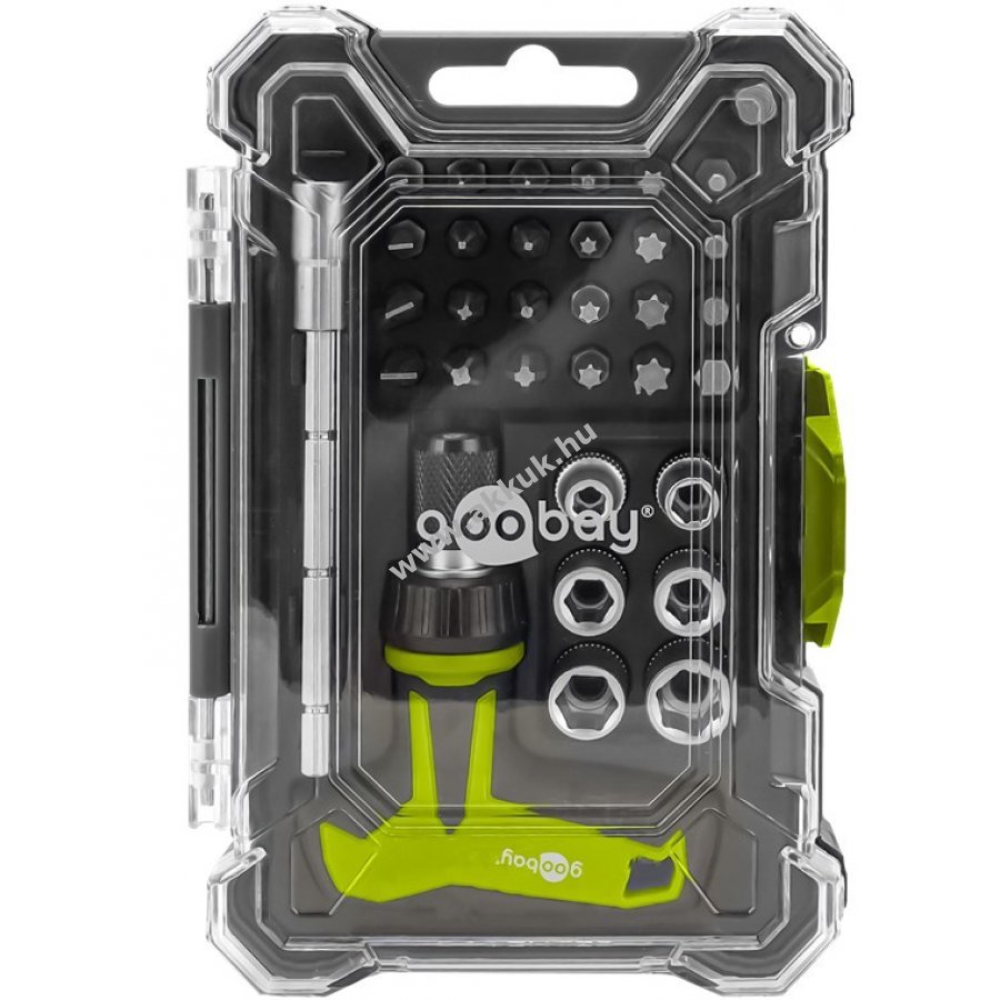 Tartozékok: 1x csuklós kulcs adapter 6x CRV dugókulcs 5-10 mm méretben 24x ütésálló S2 acél bit