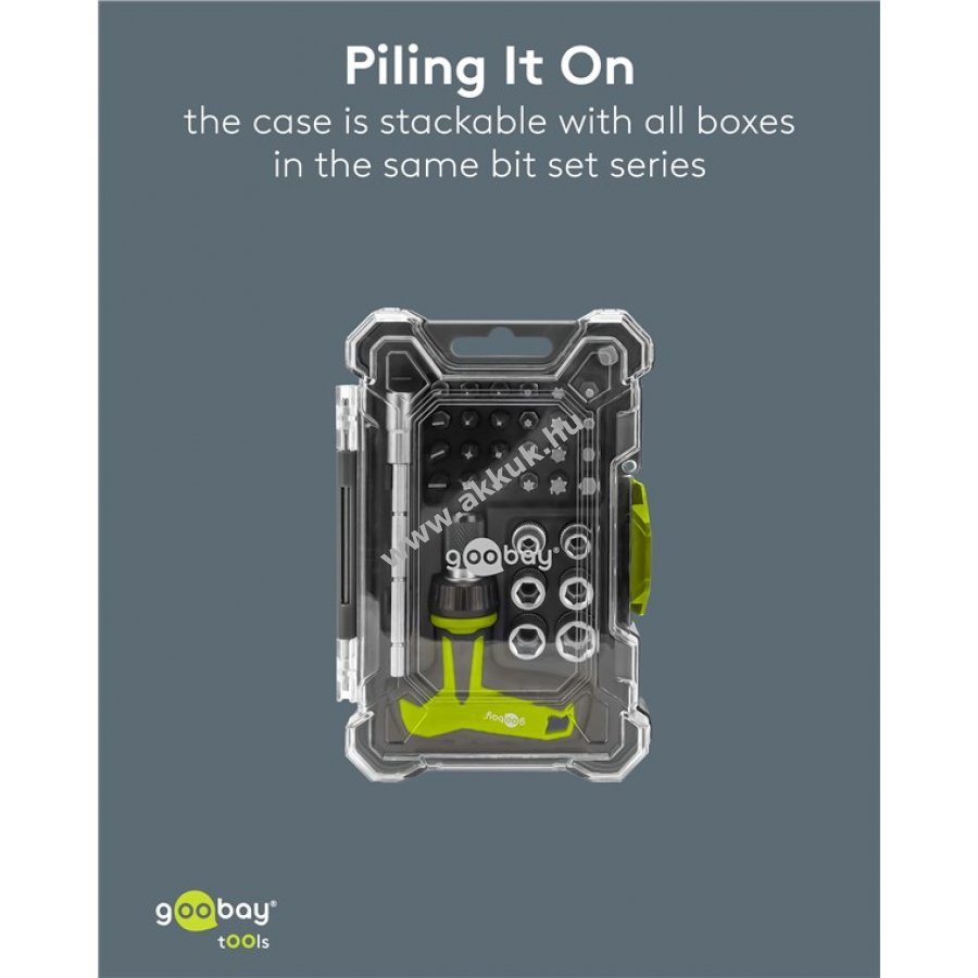Praktikus csavarhúzó készlet T-bitháttartóval és kényelmes tárolódobozzal amely tartalmaz egy T-ratchetet a kényelmes és hatékony csavarozáshoz. A doboz gumírozott sarkai és masszív zárja ellenállóvá teszik a szettet. A dobozok egymásra rakhatók a sorozaton belül.