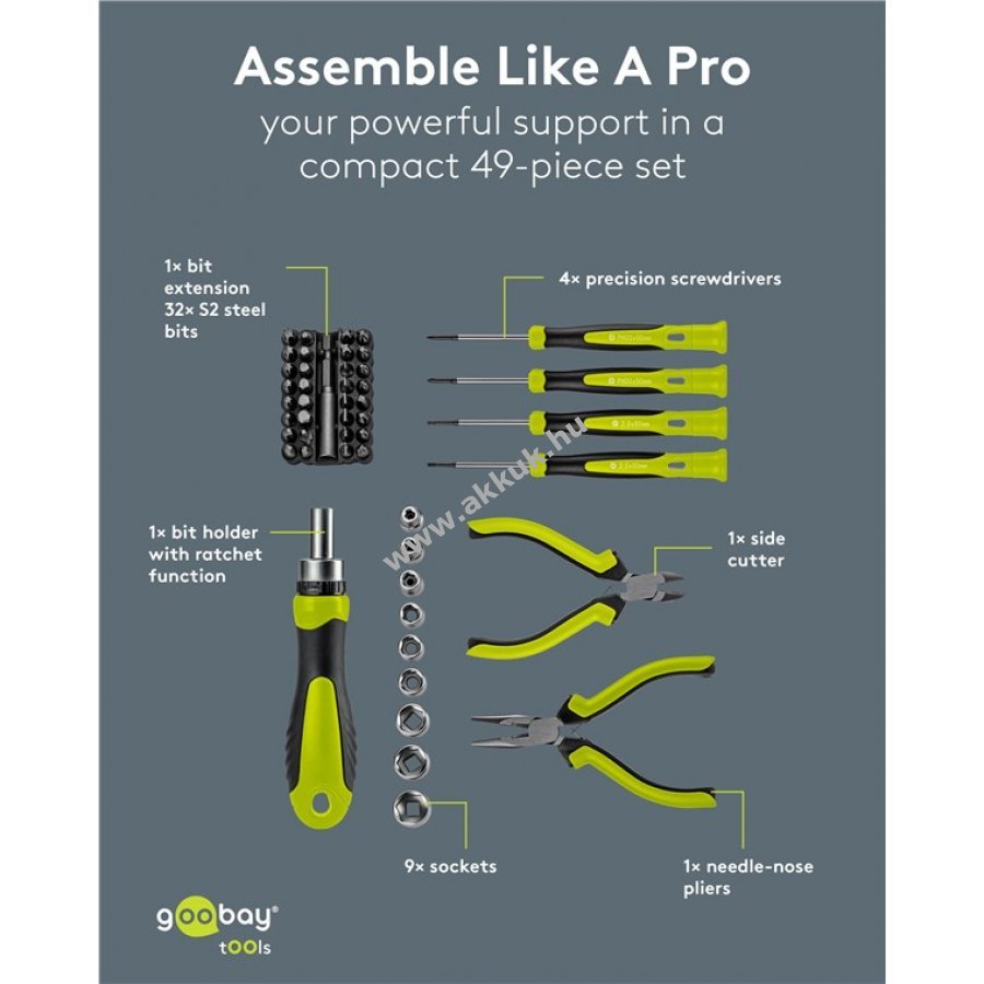 9x dugókulcs és 32x ütésálló S2 acélból készült bit: 8x lapos, 12x kereszt (PH PZ), 7x belső hatszög (T), 5x hatszög (H).