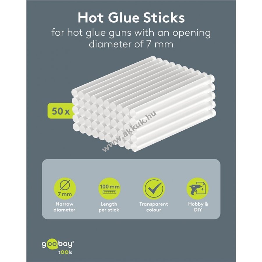 Forró ragasztórudak 7 mm átmérőjű ragasztópisztolyokhoz. Alkalmasak modellépítéshez, barkácsoláshoz, dekoráláshoz és javításhoz. Többféle anyaghoz használható, például kartonhoz, kerámiához, fához, fémhez, bőrhöz, akrilhoz és üveghez. A ragasztó száradás után átlátszó, így diszkrét ragasztási felületet biztosít. Kiváló folyási tulajdonságok olvasztás után a könnyű kezelhetőségért és rugalmas munkavégzésért. Gyorsan szárad, ezért ideális kis vagy laza alkatrészek ragasztásához. Egy rúd mérete: 7 mm átmérő, 100 mm hossz.