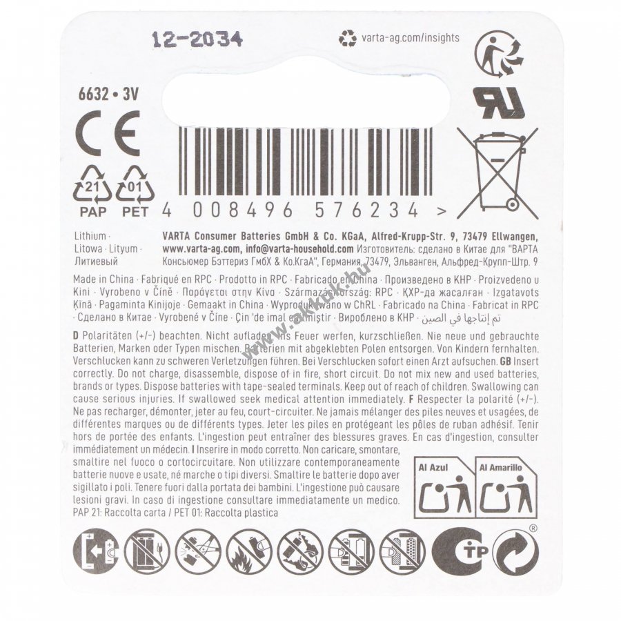3V 140mAh/0.5Wh Li-Ion 2 gr. Varta Szavatosság (további részletek)