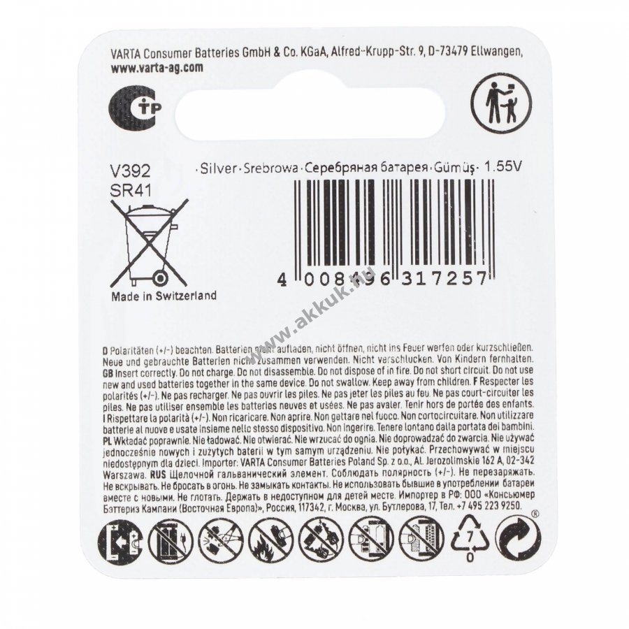 1.55V 40mAh Ag2O Varta Szavatosság (további részletek)