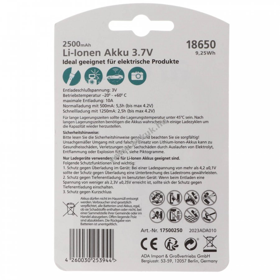 3.7V 2500mAh/9.25Wh Li-Ion 18.5mm x 67.5mm 46 gr. AccuCell Szavatosság (további részletek)