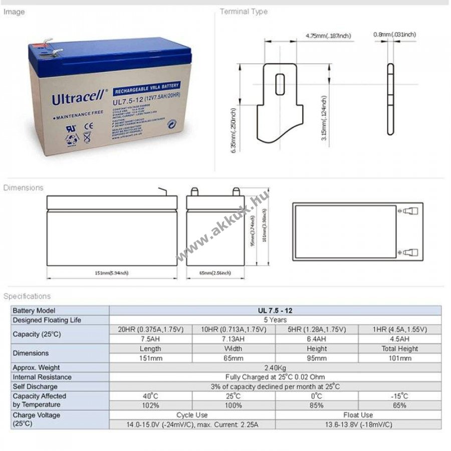 12V 7500mAh/90Wh Pb 151mm 2400 gr. Ultracell 1 év jótállás (további részletek)