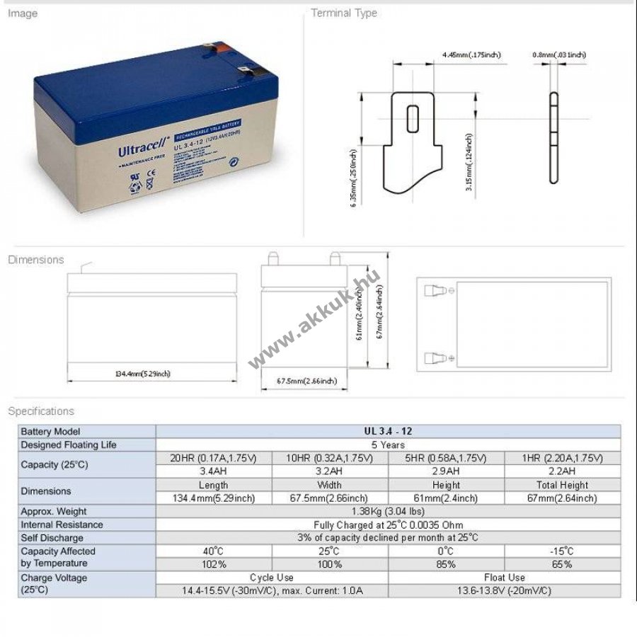 12V 3400mAh/40.8Wh Pb 1380 gr. Ultracell Szavatosság (további részletek)