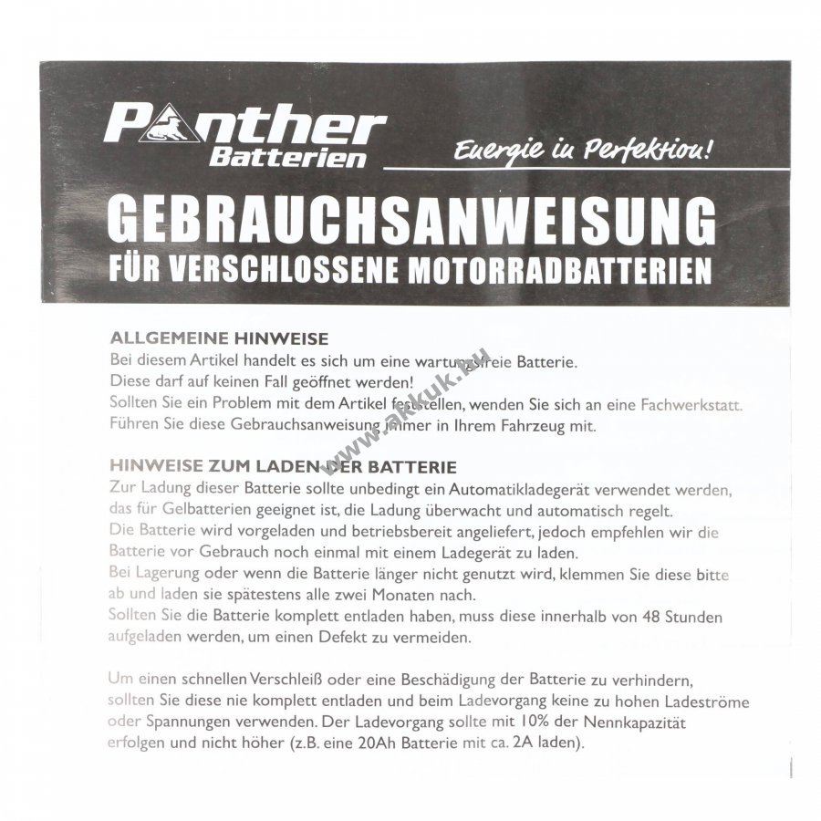 Ez a Panther savas ólom akkumulátor kiváló minőségű| és ideális választás hibás vagy régi akkumulátor cseréjéhez| illetve további pótakkumulátorként útközben. Az akkumulátor strapabíró felépítése és a kiváló minőségű anyagok biztosítják a hosszú élettartamot és a megbízható teljesítményt| még intenzív használat esetén is. Az ólom-savas technológia megbízható energiaellátást nyújt| és alkalmas különféle alkalmazásokhoz. Az akkumulátor használata és töltése egyszerű| a szokásos töltőn vagy tápegységen keresztül. Akkumulátoraink kizárólag új| minőségi anyagokból készülnek| garantálva a megbízhatóságot és a tartósságot.