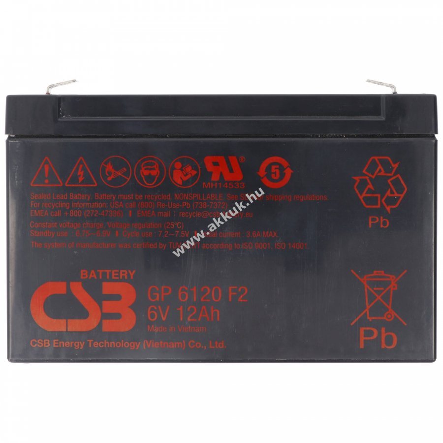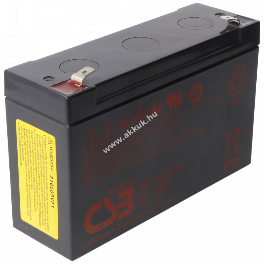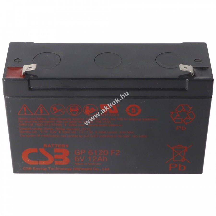 CSB-GP6120F2 zárt ólomakkumulátor (SLA/VRLA), 6V 12Ah, újratölthető, 6,3mm széles Fast-On csatlakozókkal. Méretek kb. 151mm x 50mm x 100mm