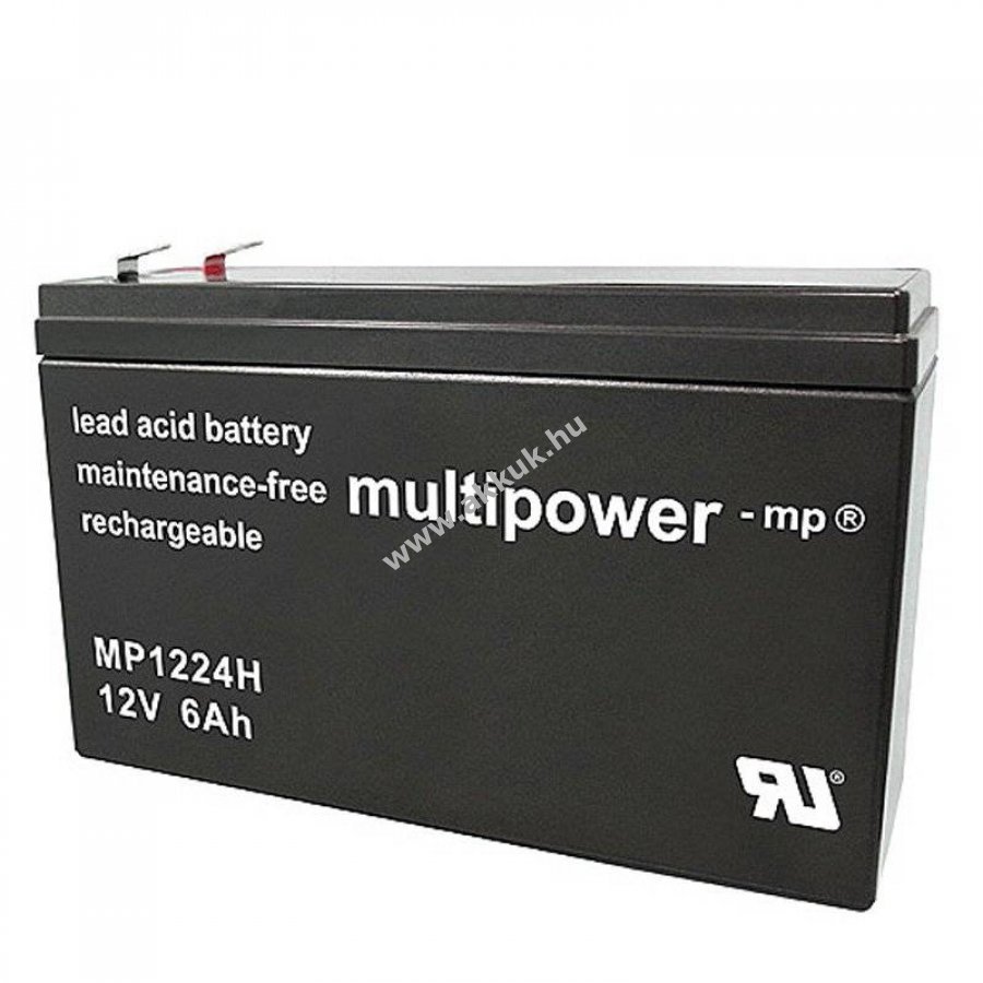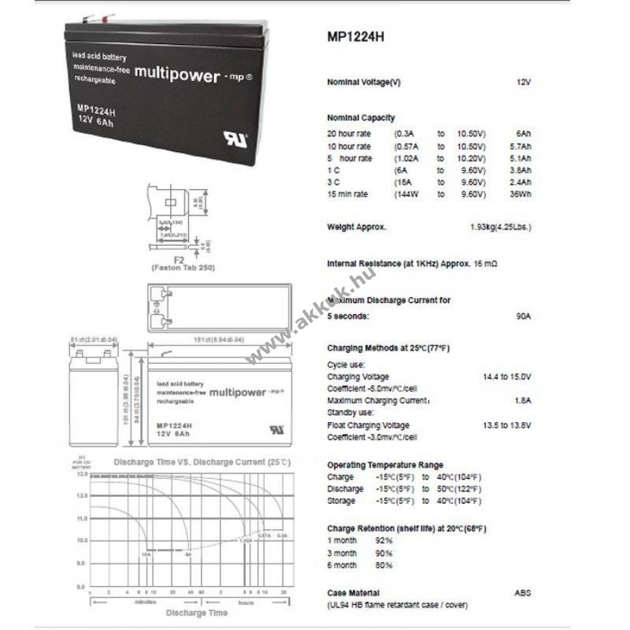 Multipower MP1224H 12V 6Ah Faston 6,3mm újratölthető, karbantartásmentes ólom-zselés (AGM) akkumulátor, zárt szelepregulált kivitel. Alacsony önkisülés és hosszú használati idő jellemzi, alkalmas készenléti és párhuzamos üzemre külön ciklusálló kivitel is elérhető.