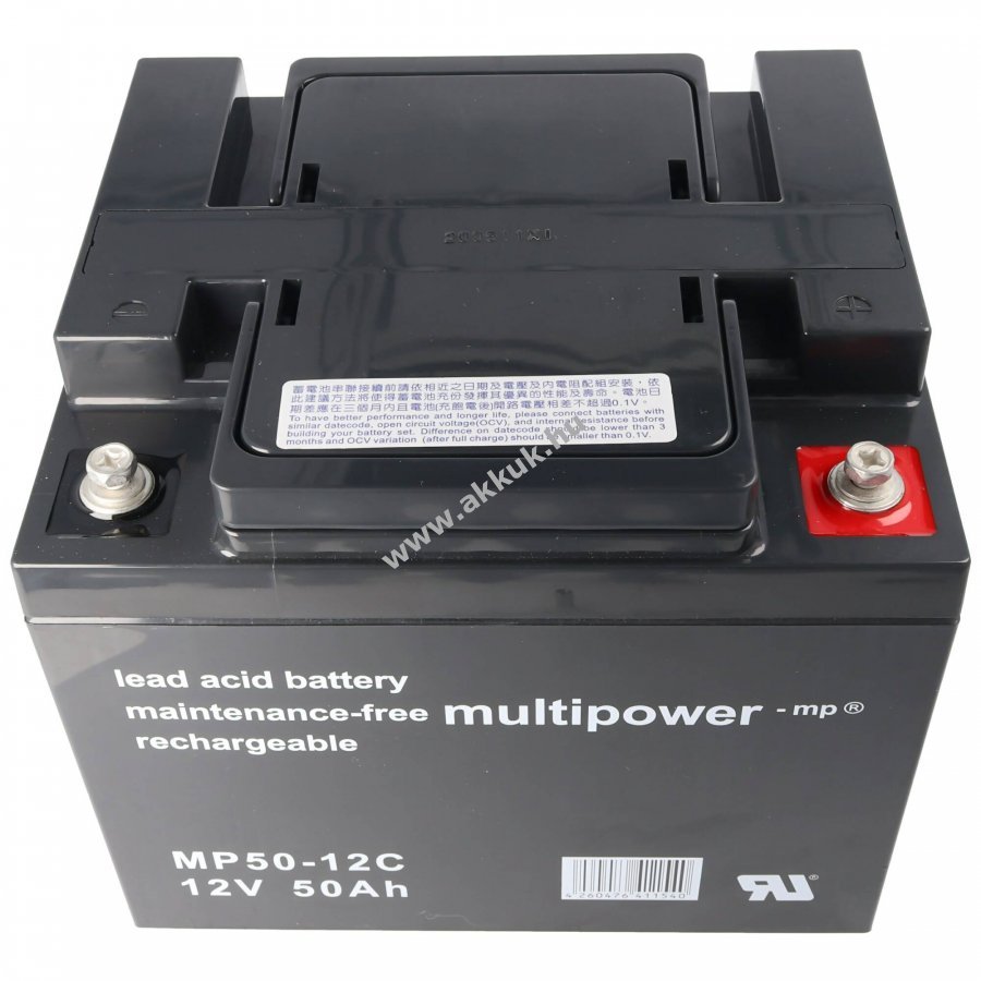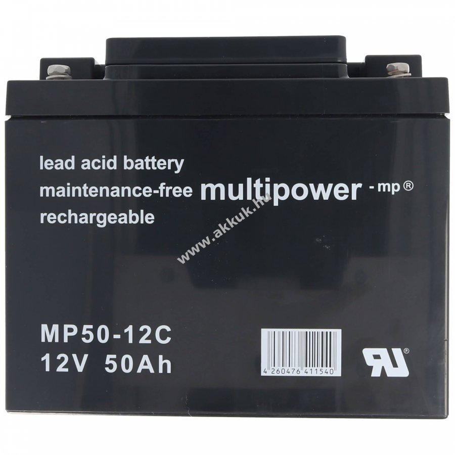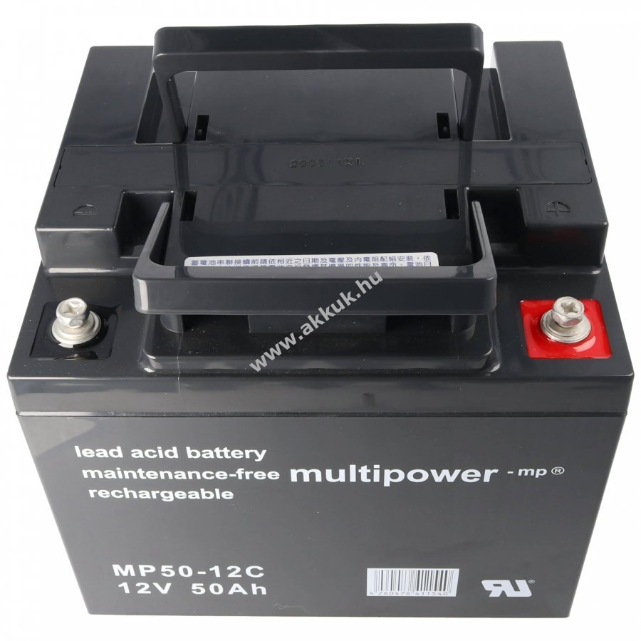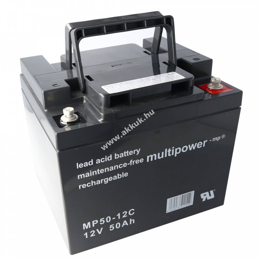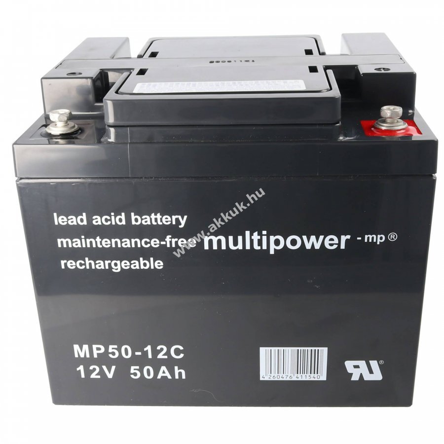 Multipower MP50-12C zárt, szeleppel szabályozott ólom akkumulátor (AGM) hosszú élettartammal és alacsony önkisüléssel. Újratölthető és karbantartásmentes, kifejezetten ciklikus használatra tervezve.