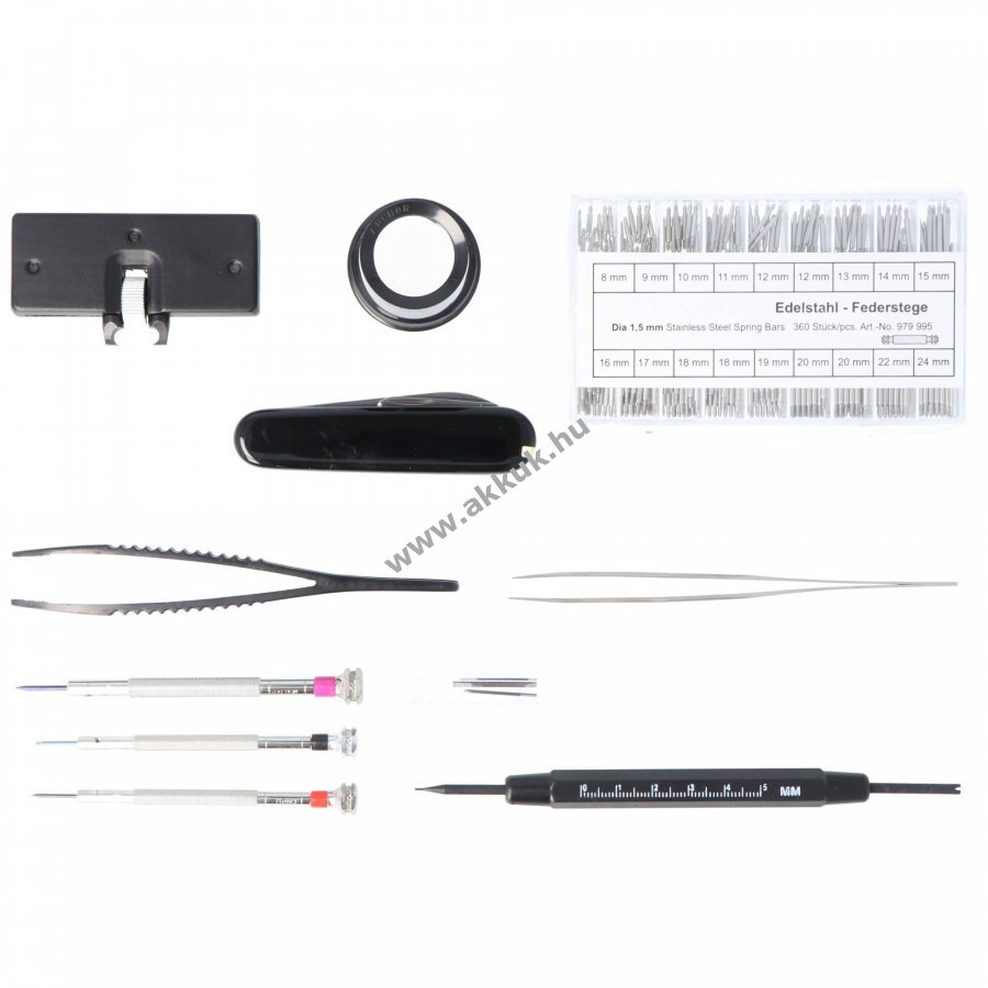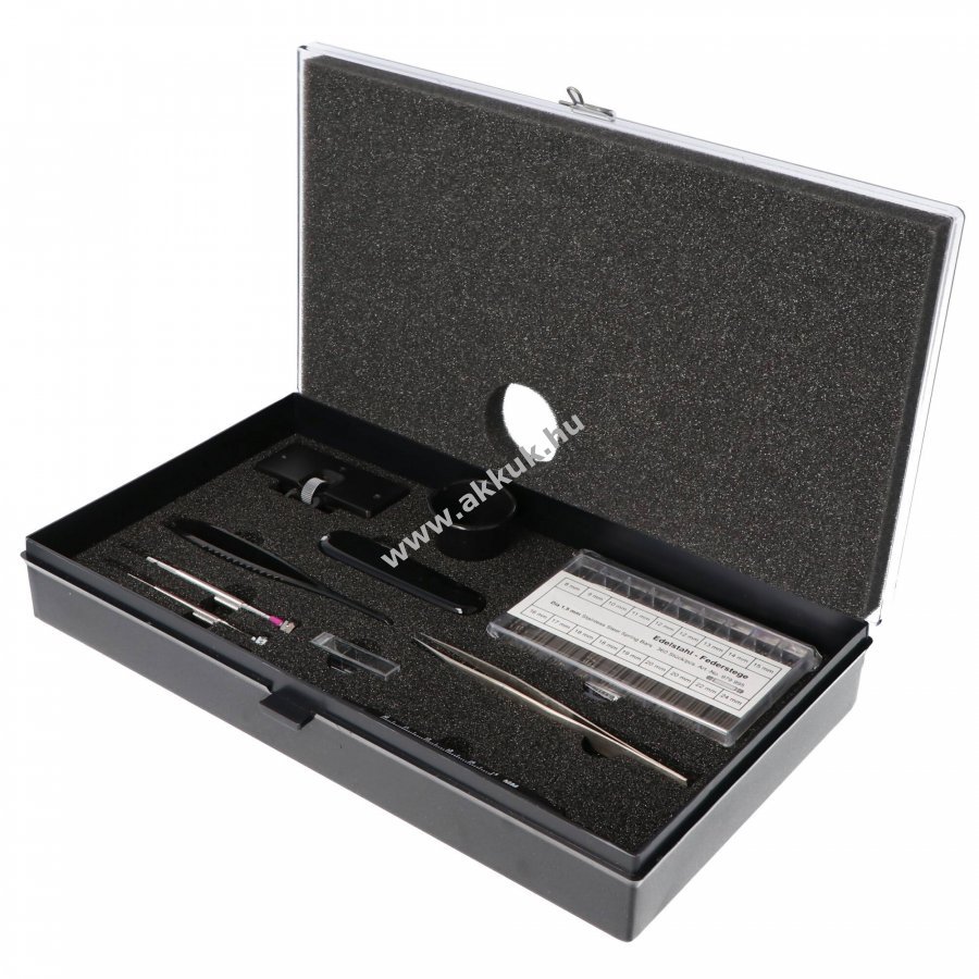 Magnum műhely- és szervizkészlet hobbi órások számára, minőségi eszközökkel és válogatott pótalkatrészekkel a gyors elem- és szíjcseréhez.