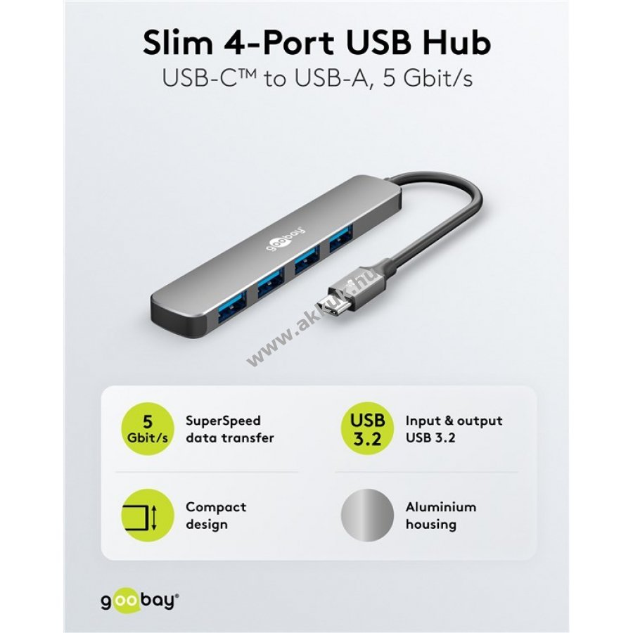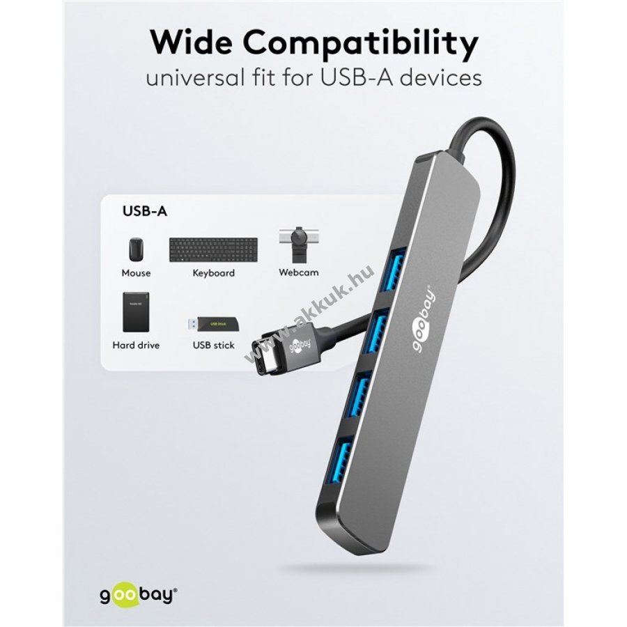 Maximális csatlakoztathatóság egy USB-C porton keresztül táblagépekhez okostelefonokhoz vagy laptopokhoz. A Slim hub négy USB-A portot biztosít egy USB-C csatlakozóról 5 Gbit/s adatátviteli sebességgel. Megszünteti a csatlakozóváltás és a kevés port okozta problémákat.
