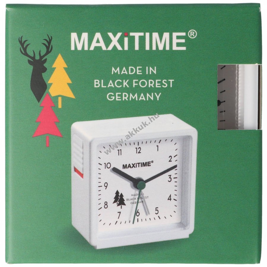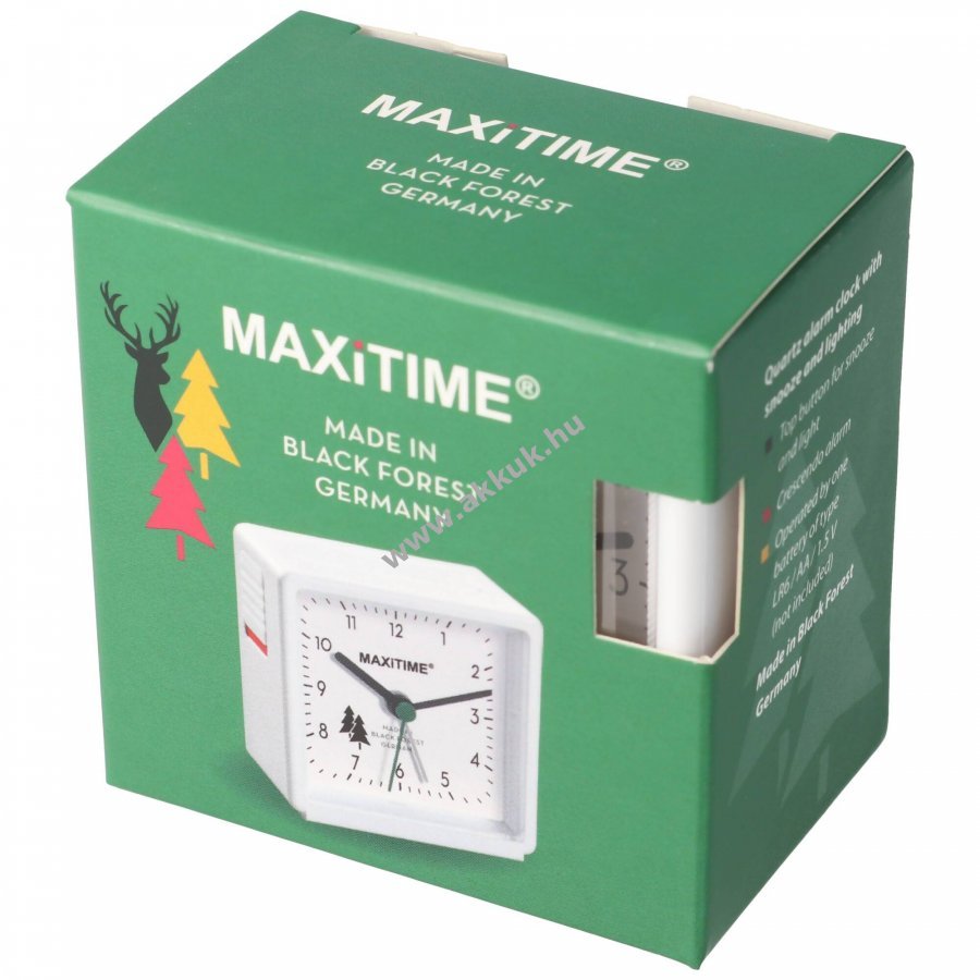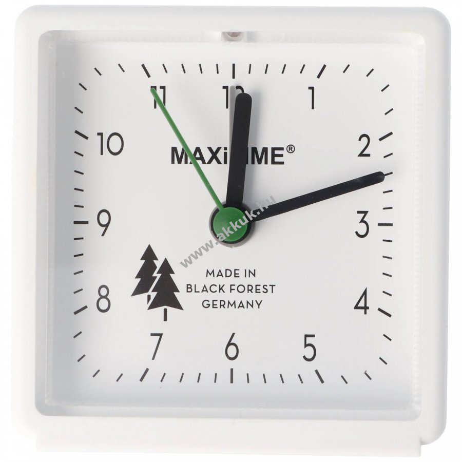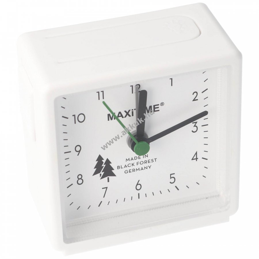 Fehér Maxitime kvarc ébresztőóra fehér számlappal, beépített világítással és tetején szundi/önellenőrző fénygombbal. 1 darab AA (LR6) 1,5V Alkaline elem mellékelve. Gyártva Németországban (Schwarzwald).