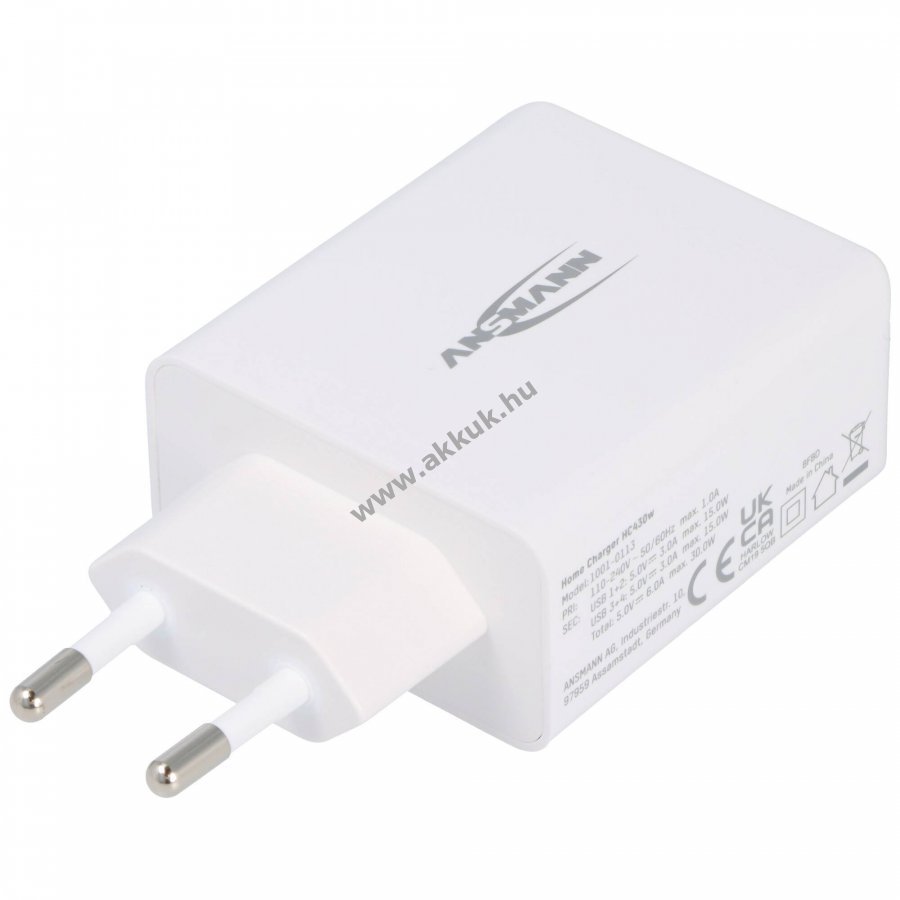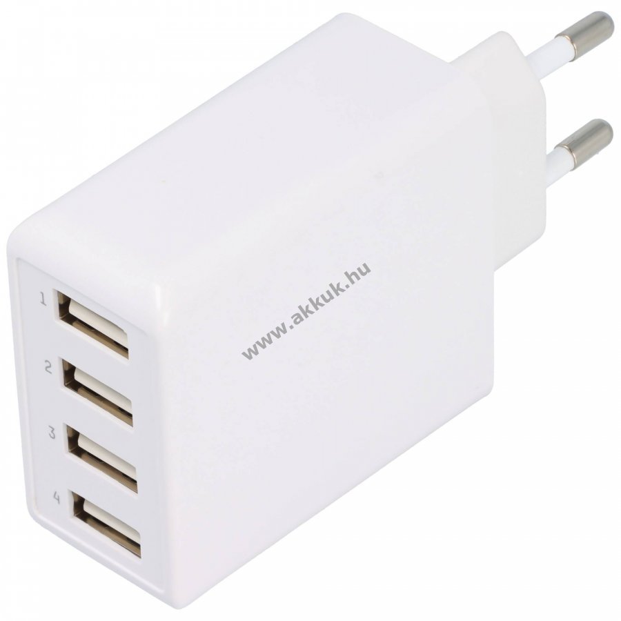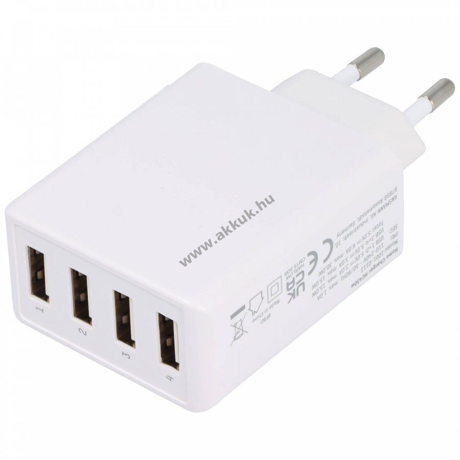 Ansmann HC430 kompakt 4 portos USB töltő, amely maximális kimeneti teljesítménnyel 30W megbízhatóan tölti az okostelefonokat, tableteket és egyéb USB-eszközöket. 5VDC kimenet, széles bemeneti feszültségtartomány 110-240VAC, fehér kivitel.