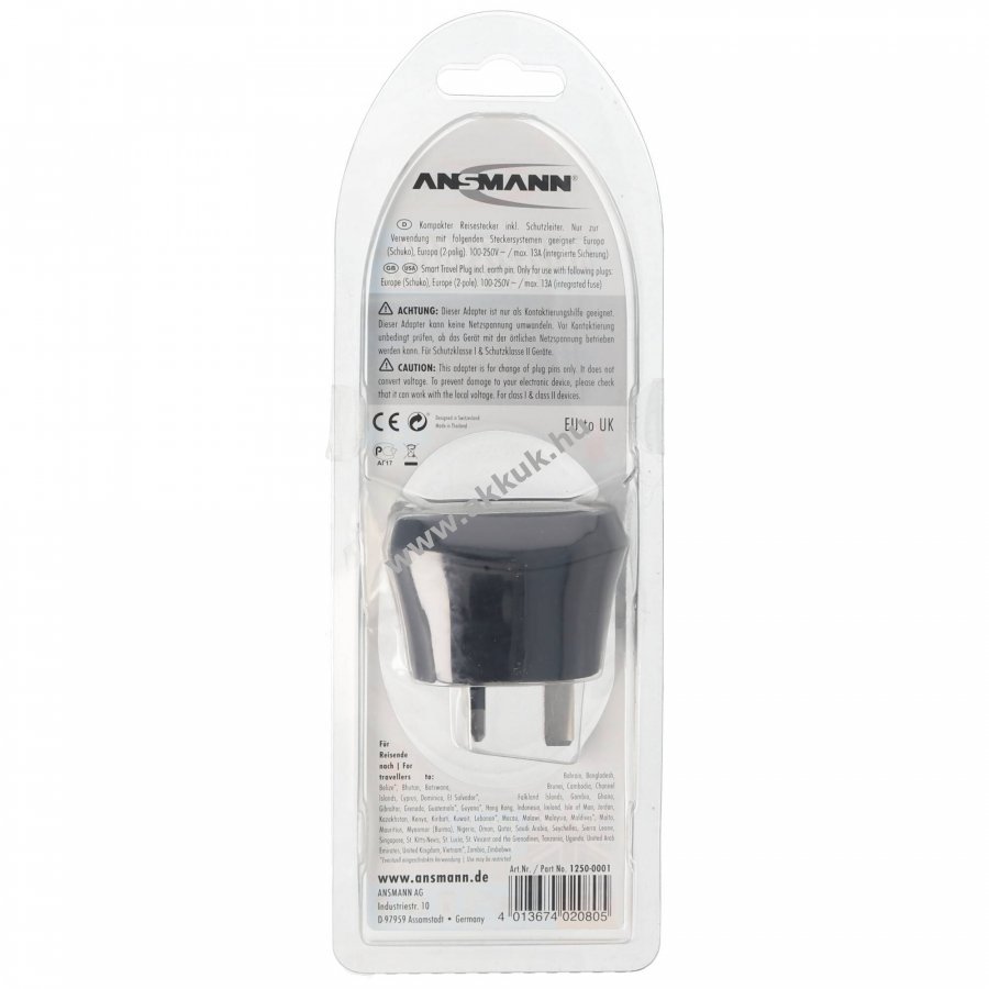 Kompakt Ansmann EU to UK utazóadapter védővezetővel, amely lehetővé teszi a Schuko és Euro dugós készülékek csatlakoztatását az Egyesült Királyság hálózatába. Ideális utazáshoz, megbízható és minőségi kivitel. Az adapter csak a csatlakozást biztosítja, nem alakítja át a hálózati feszültséget.
