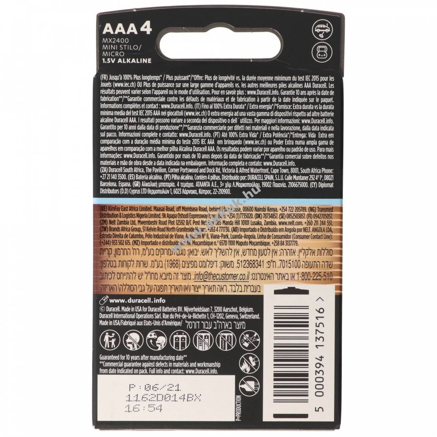 1.5V 44.5mm x 10.5mm x 10.5mm 11 gr. Duracell Szavatosság (további részletek)