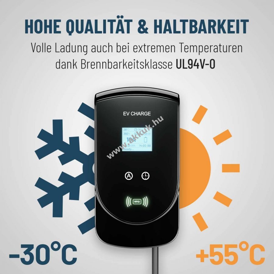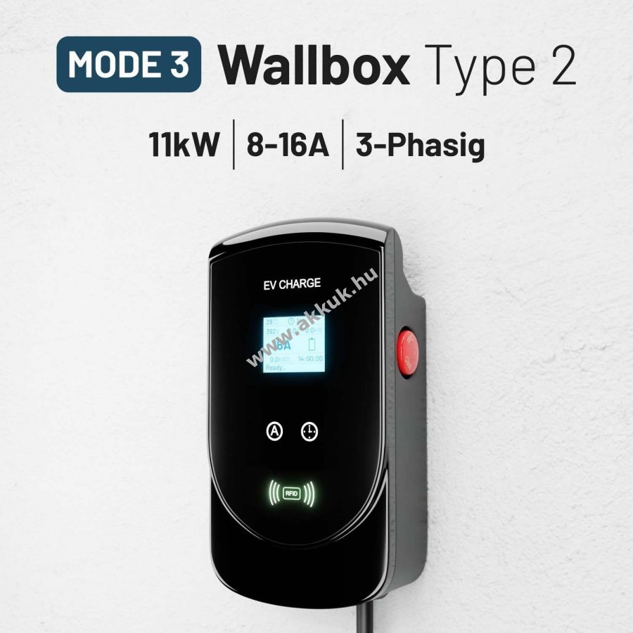 - Csomagolás: 1x Wallbox, 11kW Type 2 kábel 5m, 3x RFID kártya, szerelőkellékek