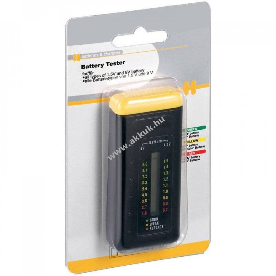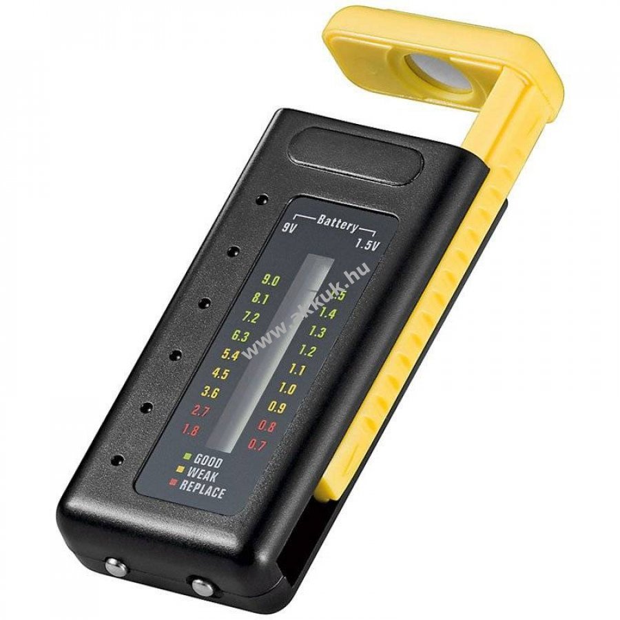 Univerzális elem- és akkumulátortesztelő LED kijelzővel, a mérések eredményét a kijelző mutatja.