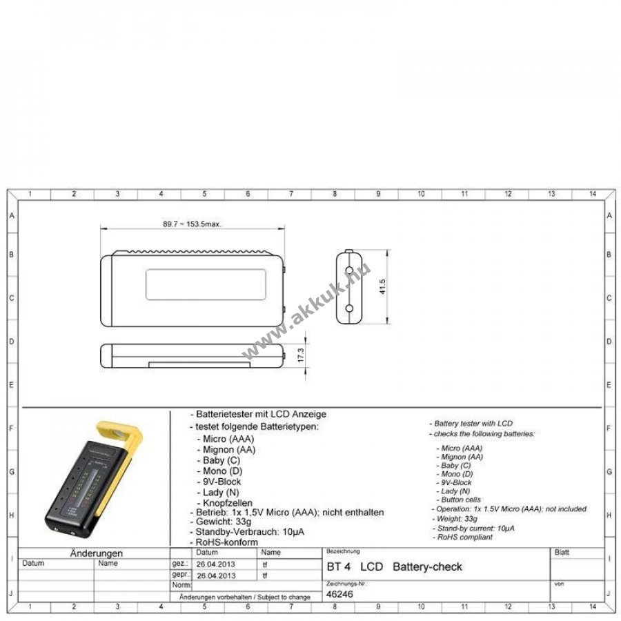 - Támogatott méretek: AAA (mikro), AA (Mignon ceruza), C (bébi méret), D (Mono), 9V-blokk, N (Lady), gombelemek