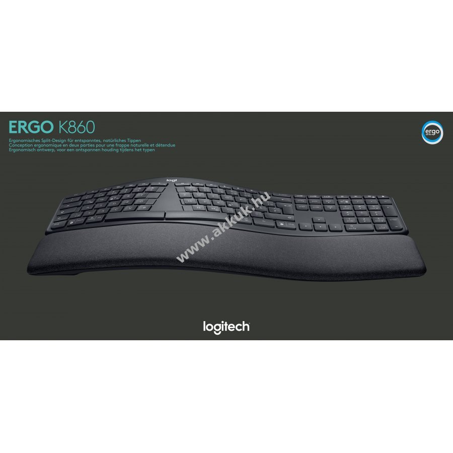 A Logitech K860 osztott ergonomikus billentyűzetet a jobb kéztartás és csökkentett izomfeszültség érdekében alakították ki, a görbített forma és a párnázott csuklótámasz kényelmes tartást biztosít.