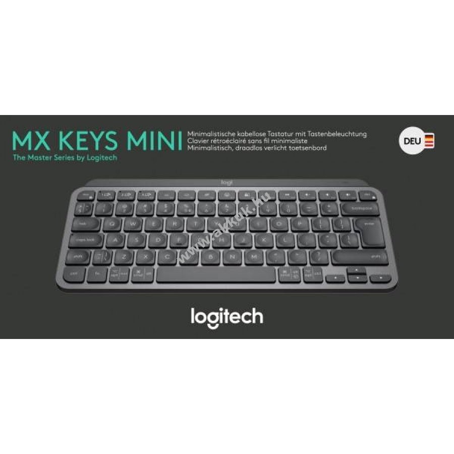 Logitech MX Keys Mini kompakt, háttérvilágított vezeték nélküli billentyűzet beépített újratölthető akkumulátorral és német (DE) kiosztással. Intelligens funkciói között megtalálható a diktálás, a mikrofon némítása és az emoji-gombok, továbbá akár 10m hatótávolságot biztosít