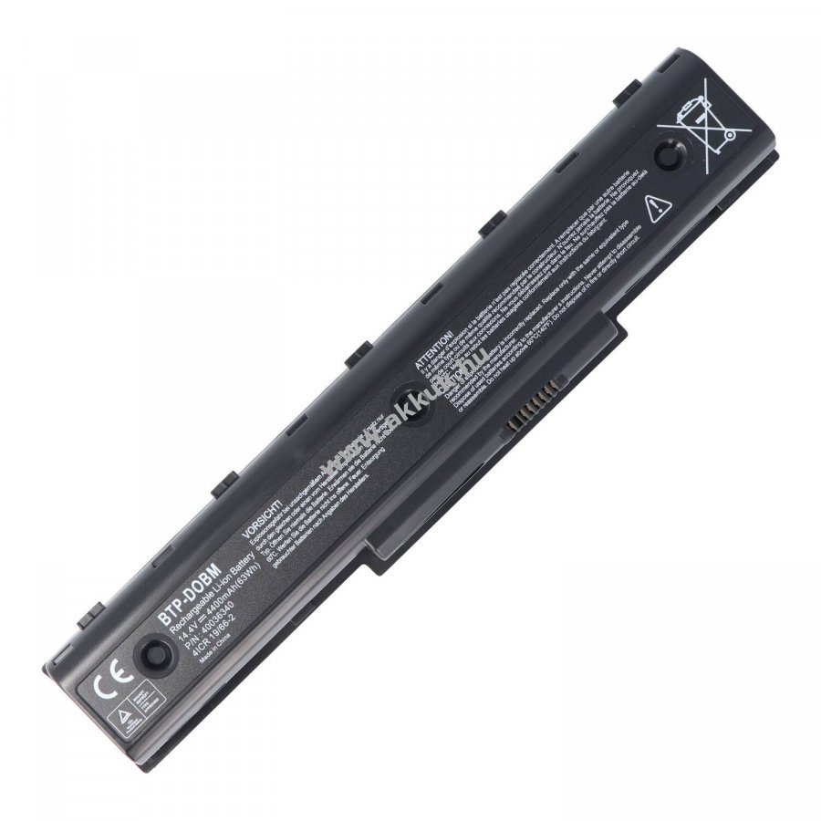 Utángyártott Li-Ion akkumulátor MEDION BTP-D0BM laptophoz. Beépített védelem túlterhelés és rövidzárlat ellen. Az eredeti töltővel és laptopban tölthető. Fekete színű, mérete kb. 302 x 94 x 40 mm, tömege 491 g.