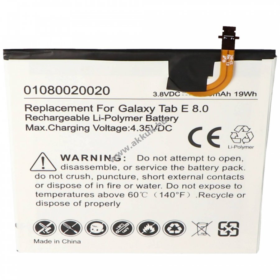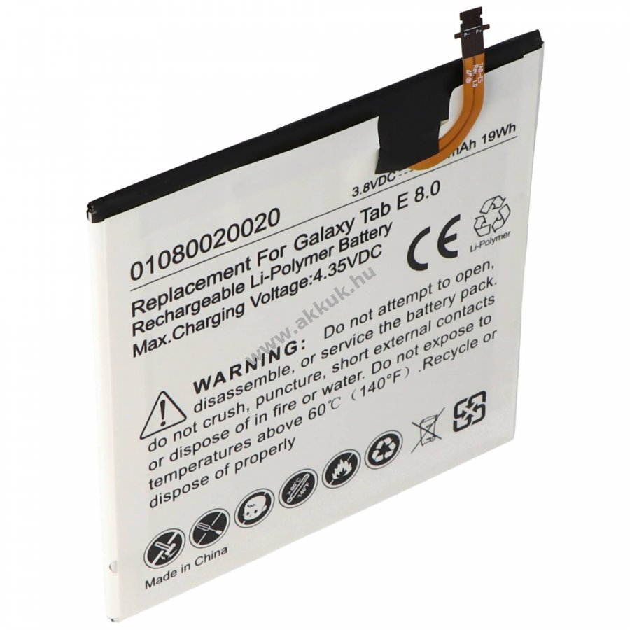 Minőségi Li-Polymer akkumulátor Samsung Galaxy Tab 5 és Galaxy Tab E 8.0 modellekhez. Védelmet nyújt túlmelegedés és túltöltés ellen. Az eredeti töltővel vagy a táblagépben tölthető. Méretei kb. 100,6 x 102,6 x 3,6 mm, súlya 84 g.