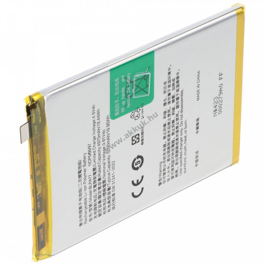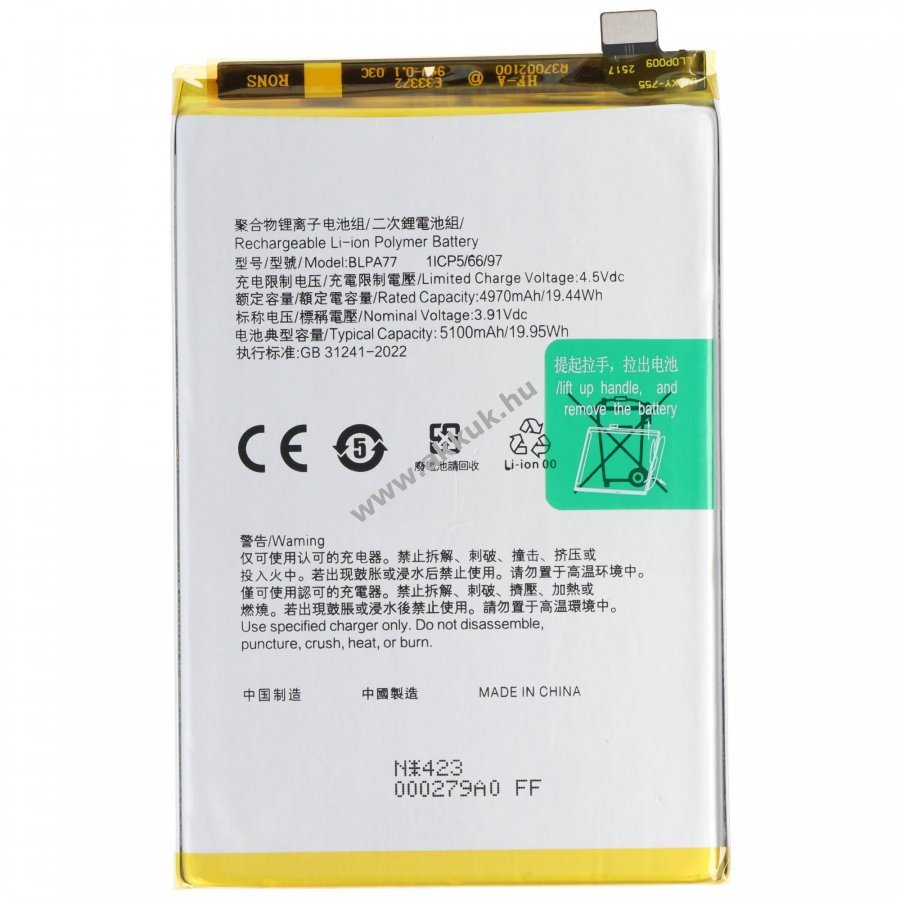 Li-Polymer technológiájú akkumulátor OPPO A40 és A40m készülékekhez. 3,91V feszültség és 5100mAh kapacitás hosszú üzemidőt biztosít. Beépített védelem rövidzárlat és túltöltés ellen garantálja a biztonságos használatot. Méreteiben megegyezik az eredeti OPPO BLPA77 akkuval, így pontosan illeszkedik és könnyen cserélhető.