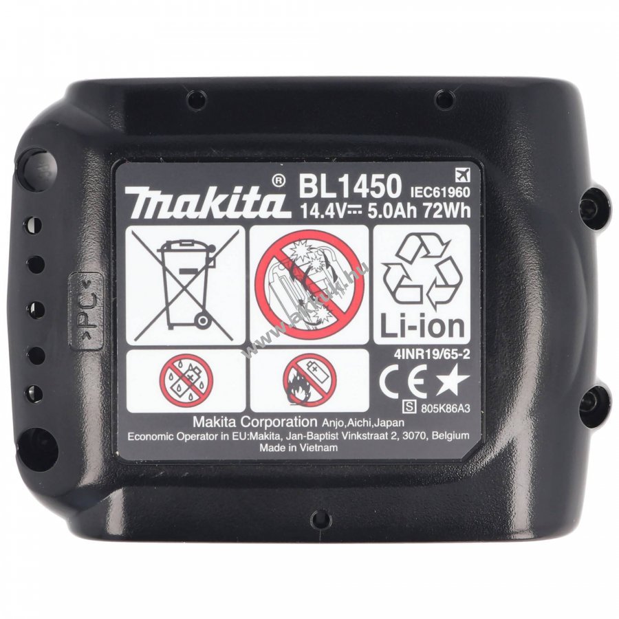 Eredeti Makita BL1450N Li-Ion akkumulátor 14,4V feszültséggel és 5000mAh kapacitással. Kiváló teljesítményű akkumulátor Makita akkumulátoros szerszámokhoz. Kompatibilis számos Makita modellhez, például 194065-3, BL1415, BL1430, BL1450 és mások. Tömege 369 g, méretei kb. 95 x 73,5 x 45 mm, fekete színben.