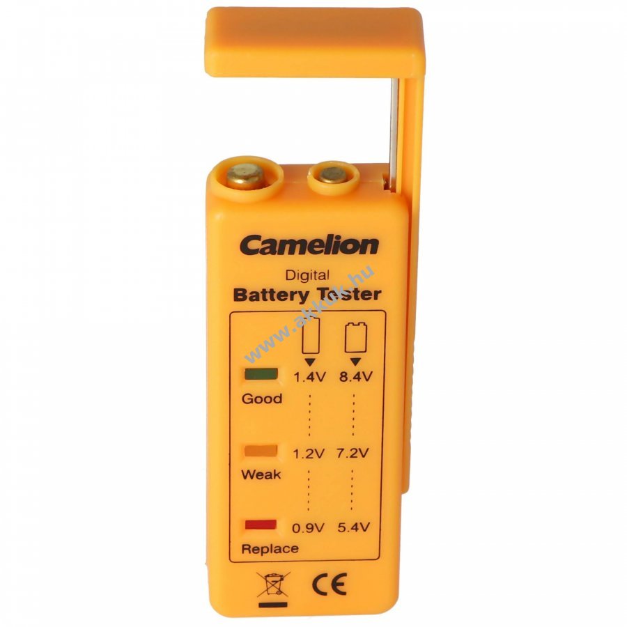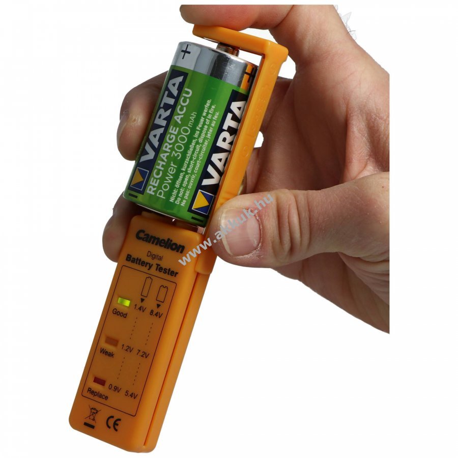 Kompakt LED elem teszter Camelion BT-0503 a különböző méretű elemek gyors ellenőrzéséhez.
