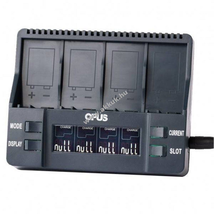 OPUS BT-C900 intelligens gyors töltő 1-4 darab 9V blokkokhoz (NiMH, NiCd és csak beépített védelmi elektronikával rendelkező Li-ion). LCD-kijelzős, minden töltőhely külön-külön működik és kijelzi a töltőáramot, akkufeszültséget, kapacitást, belső ellenállást és az időt.