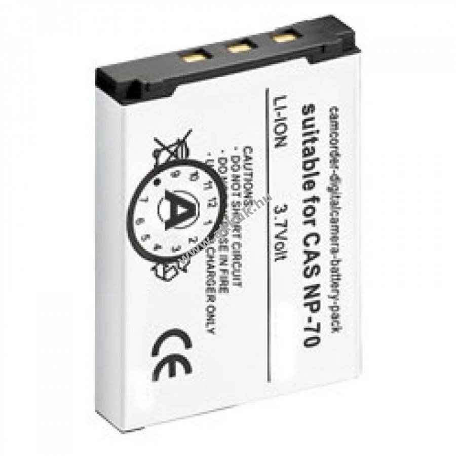 Li-Ion akku Casio NP-70, EX-Z150, EX-Z250 digitális fényképezőgépekhez. Magas minőségű utángyártott akkumulátor beépített túltöltés- és túlmelegedés elleni védelemmel, valamint rövidzárlat elleni védelemmel. Kompatibilis az eredeti töltőkkel. Méretek: 44,1x31,55x7,2 mm, súly: 22 g.