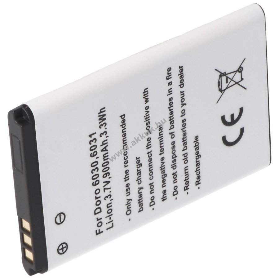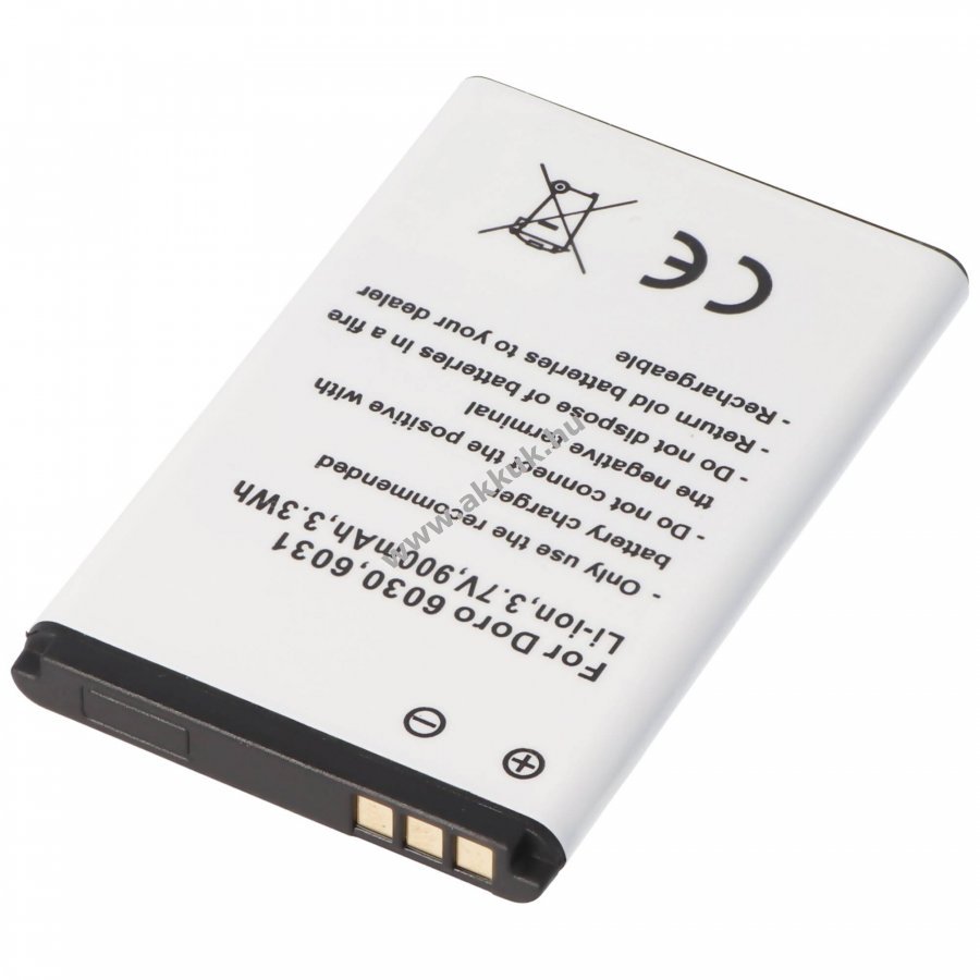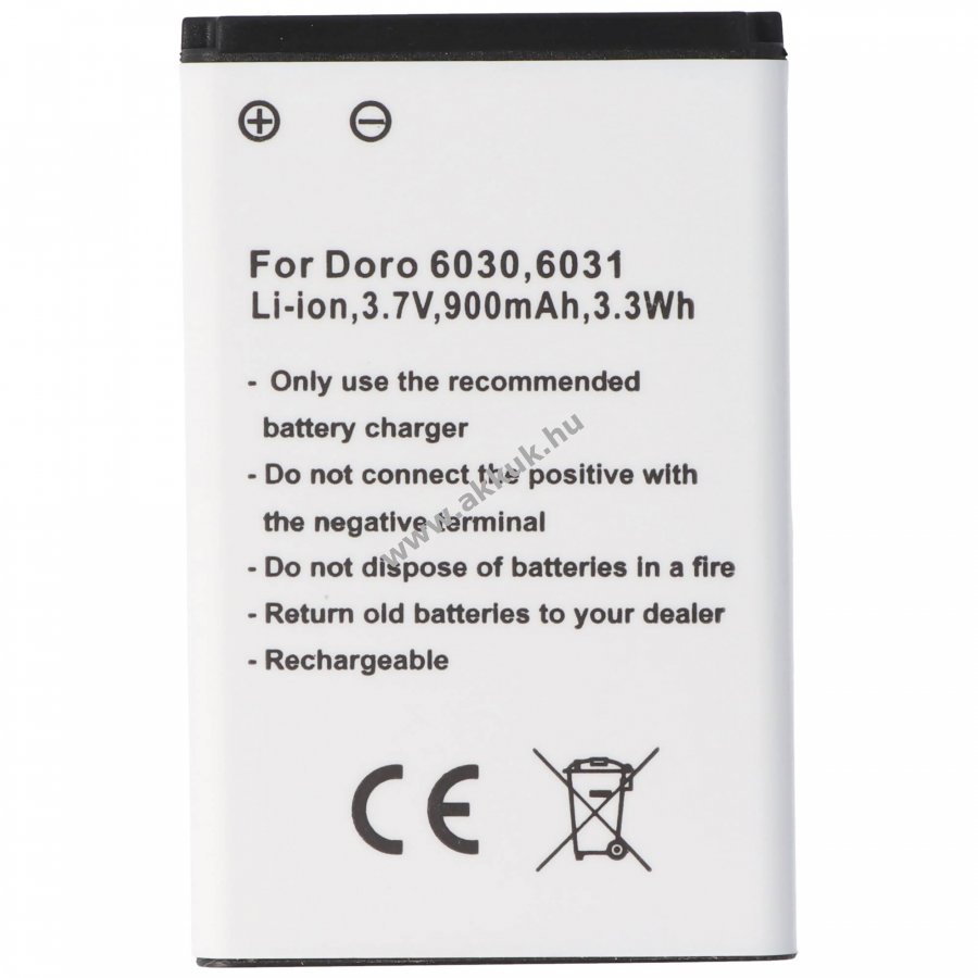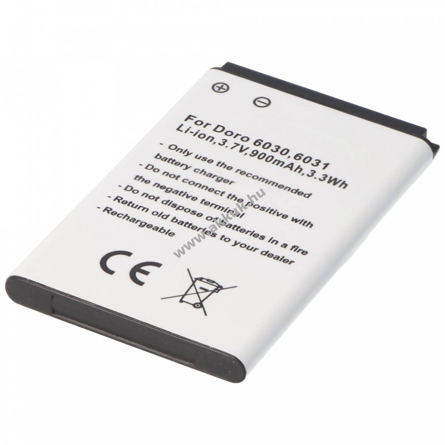 Utángyártott Li-ion akkumulátor Doro 6030, 6031 és több modellhez. 3,7V feszültség, 900mAh kapacitás, 3,3Wh energia. Kompakt méret, beépített védelem rövidzárlat és túltöltés ellen. Töltővel kompatibilis, nincs memóriahatás.