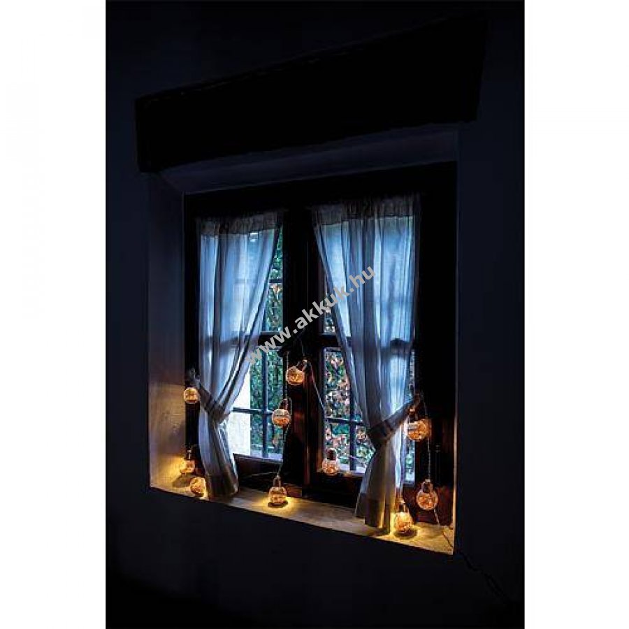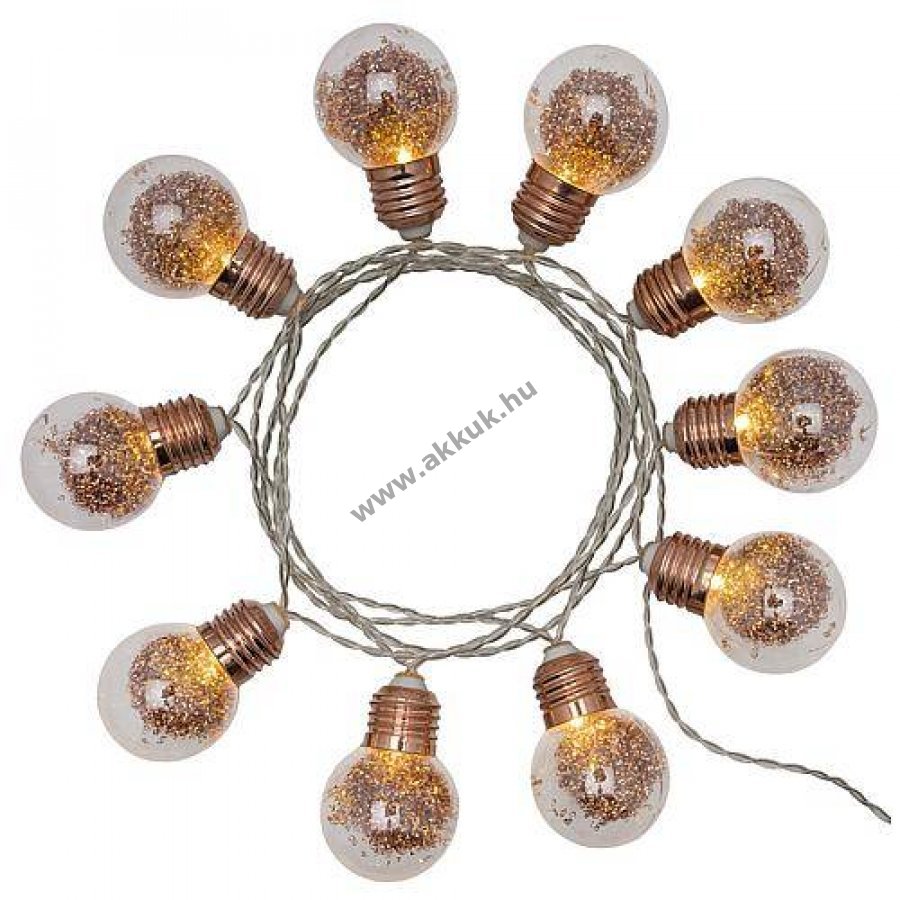 LED cseppforma (G50) lámpákkal díszített fényfüzér csillogó rézszínű glitterrel és rézszínű fém foglalattal, átlátszó vezetékkel és elemtartó dobozzal kapcsolóval.