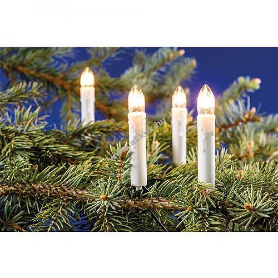 Beltéri fényfüzér topgyertya kialakítású fehér tokozással, 10 izzóval, 3,6m világító hosszal és 5,1m teljes hosszúsággal, osztható csatlakozóval, pótizzóval és rögzítőkapcsokkal.
