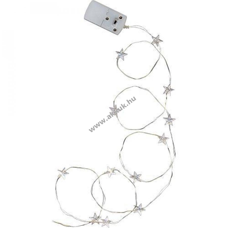 LED csillag fényfüzér 12 átlátszó csillaggal O1,3cm, fehér elemtartó kapcsolóval, vékony és rugalmas ezüst vezeték a kreatív elrendezéshez, táplálás: 2xCR2032 (elemekkel együtt), világító hossz 1,1m, teljes hossz 1,2m, beltéri használatra.