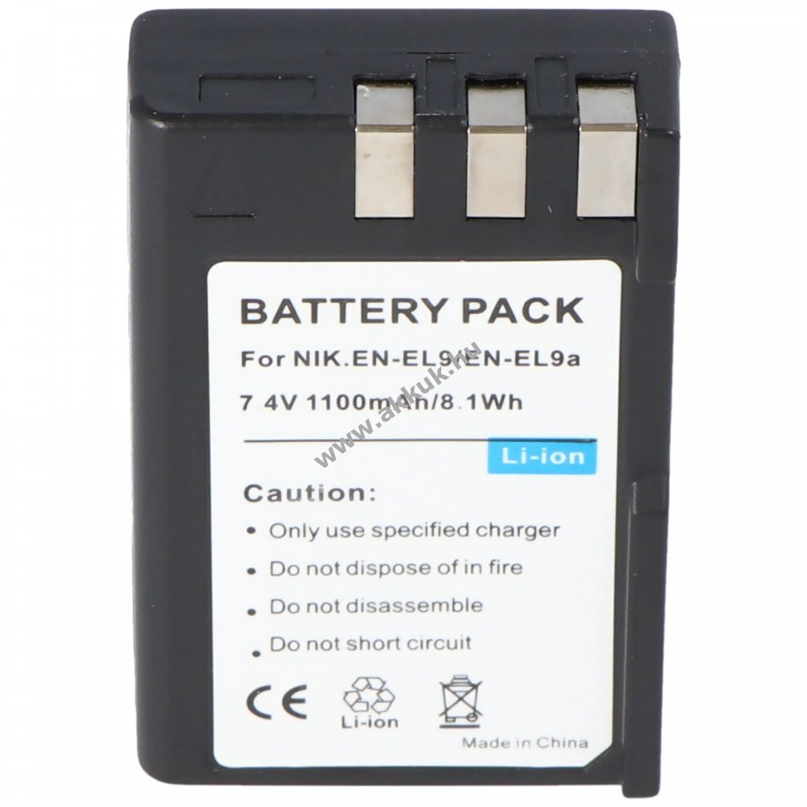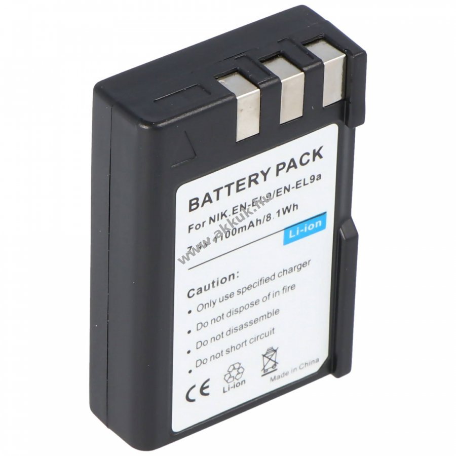Helyettesítő Li-Ion akkumulátor Nikon EN-EL9 sorozathoz, kompatibilis a D40, D40X, D60, D3000 és D5000 modellekkel. Névleges feszültség 7,4V, jellemző kapacitás 1100mAh a gyártó adatai szerint kapacitástartomány 900mAh-1300mAh. Tartalmaz védelmelektronikát túltöltés, túlmelegedés és rövidzárlat ellen. Használható a készülék eredeti töltőjével. Szín fekete. Nem eredeti Nikon EN-EL9 akku.