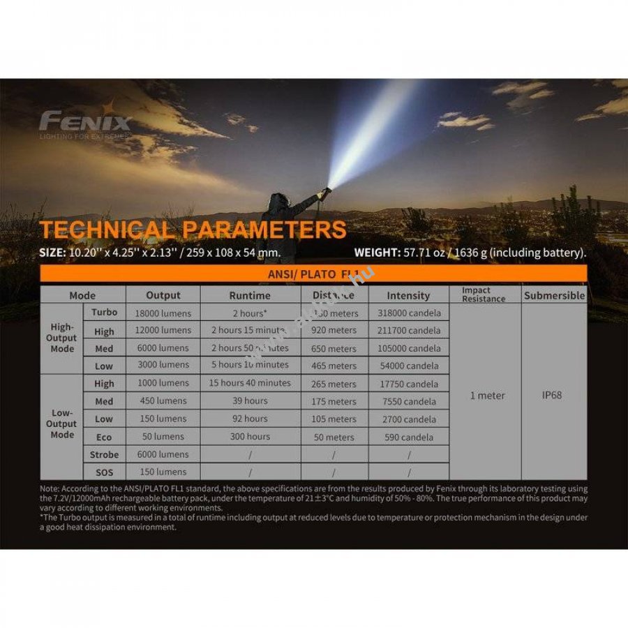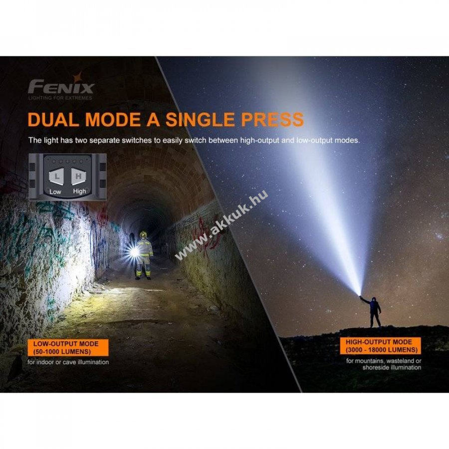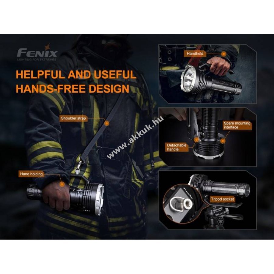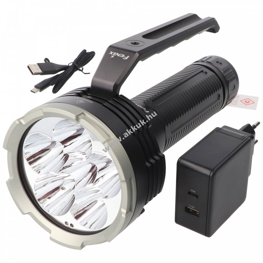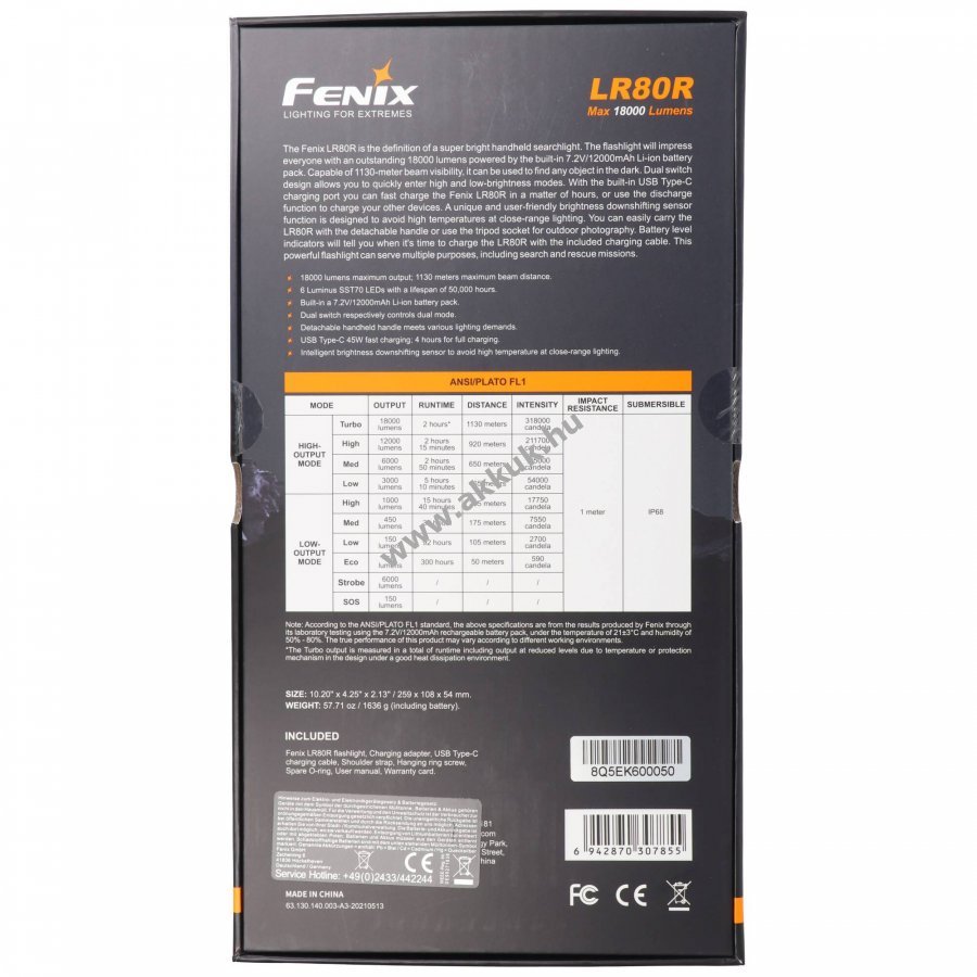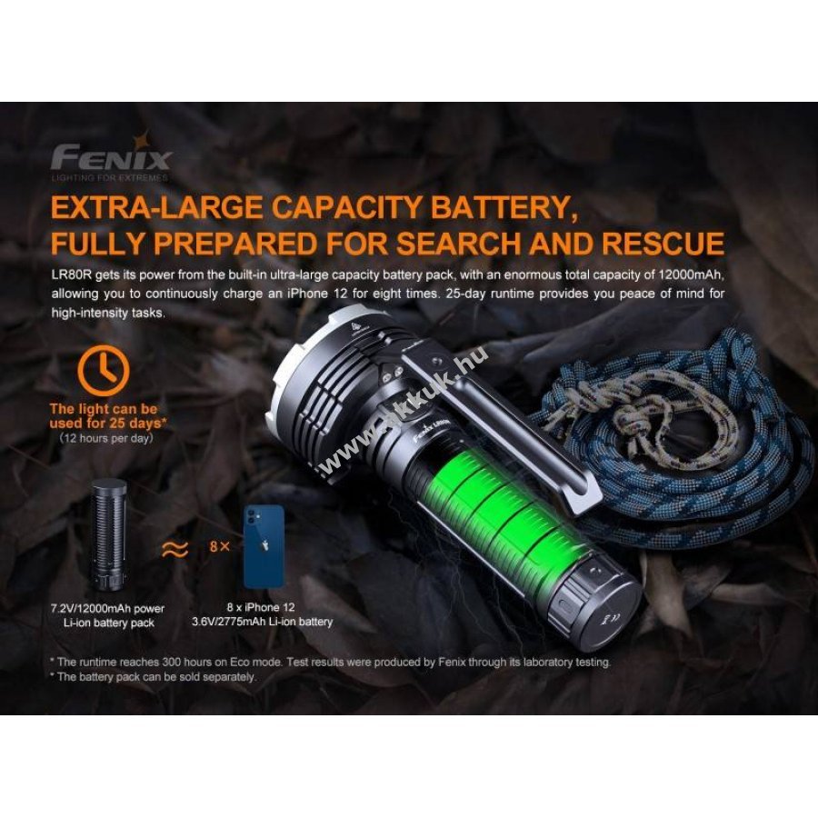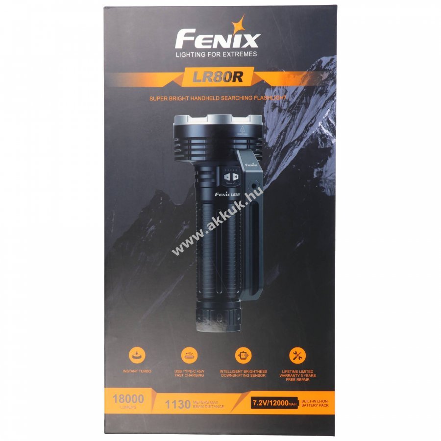 Fenix LR80R erőteljes LED keresőlámpa, akár 18000lm fényárammal és 1130m hatótávolsággal, amelyet egy 7,2V 12000mAh Li-Ion akkupakk táplál. A lámpa könnyen kezelhető dupla kapcsolóval, levehető kézifogantyúval és opcionális vállpánttal rendelkezik, továbbá állványra szerelhető beépített hő- és távolságszenzor csökkenti a fényerőt közelre világításnál.