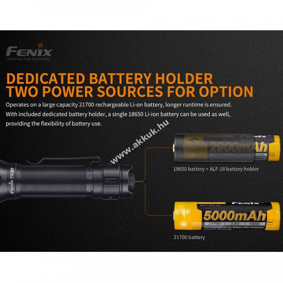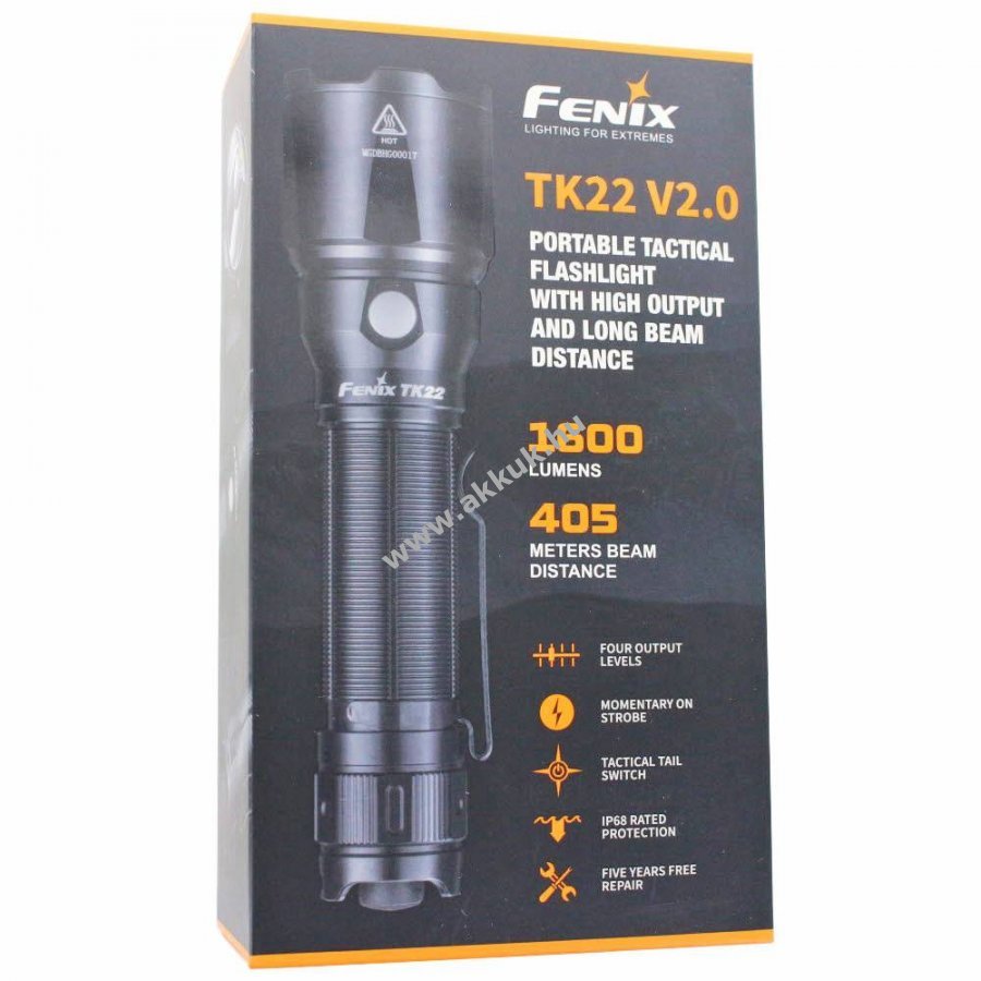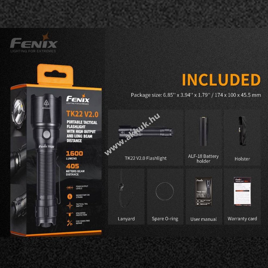 Fenix TK22 V2.0 kompakt taktikai LED zseblámpa akár 1600lm kimenettel és 405m hatótávval. Működtethető 21700 Li-Ion akkuval (nem tartozék), opcionálisan 18650 Li-Ion akkuval, ALF-18 adapter mellékelve. Méretek 150x40x25,4mm, tömeg 150g, anyag A6061-T6 alumínium, minőségi eloxálással. IP68 vízállóság, 2m.