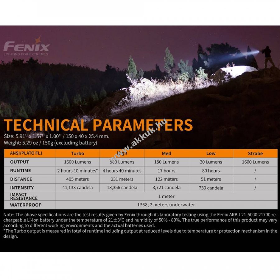 - Tesztfeltételek: Fenix ARB-L21-5000 21700 LiIon akku 21°C+/-3°C és 50%-80% páratartalom. Eredmények eltérhetnek a használt akkuktól, a lámpától, korától és a környezettől.