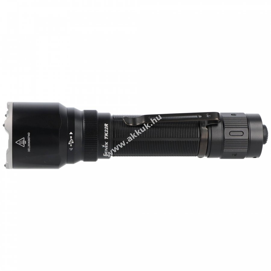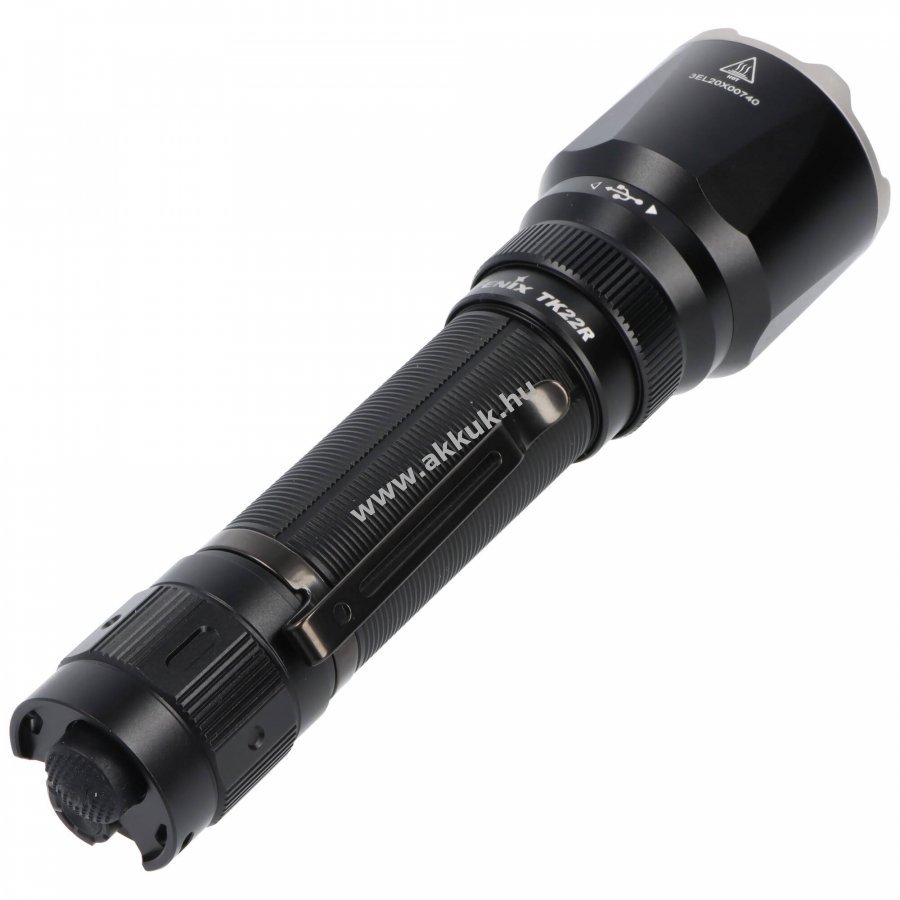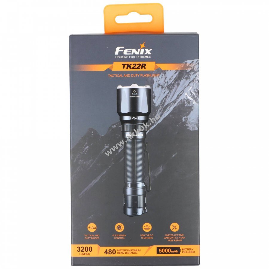 A Fenix TK22R rövid, kompakt taktikai LED zseblámpa, amely akár 3200lm fényerőt és legfeljebb 480m hatótávolságot biztosít. A lámpa Luminus SST70 LED-del rendelkezik, melynek élettartama 50000h, és FlexiSensa Control kapcsolóval kínál gyors, kényelmes vezérlést továbbá kétfunkciós taktikai kapcsolóval a Momentary-On és tartós üzem egyszerűen választható. Az ARB-L21-5000 V2.0 3,7V 5000mAh Li-Ion akku a csomag része, töltése rejtett USB-C csatlakozón keresztül történik, és a készülék APF-technológiát alkalmaz a nagyobb teljesítményért.