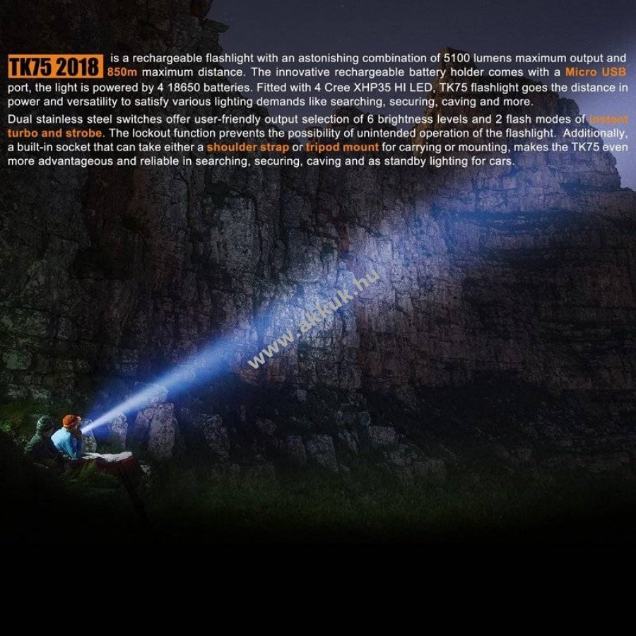 A Fenix TK75 (2015) a TK70 utódja modern 18650 Li-Ion akkumulátorokkal működik, kompaktabb és erősebb fényű, nincs NiMH memóriahatás és alacsony önkisülés.