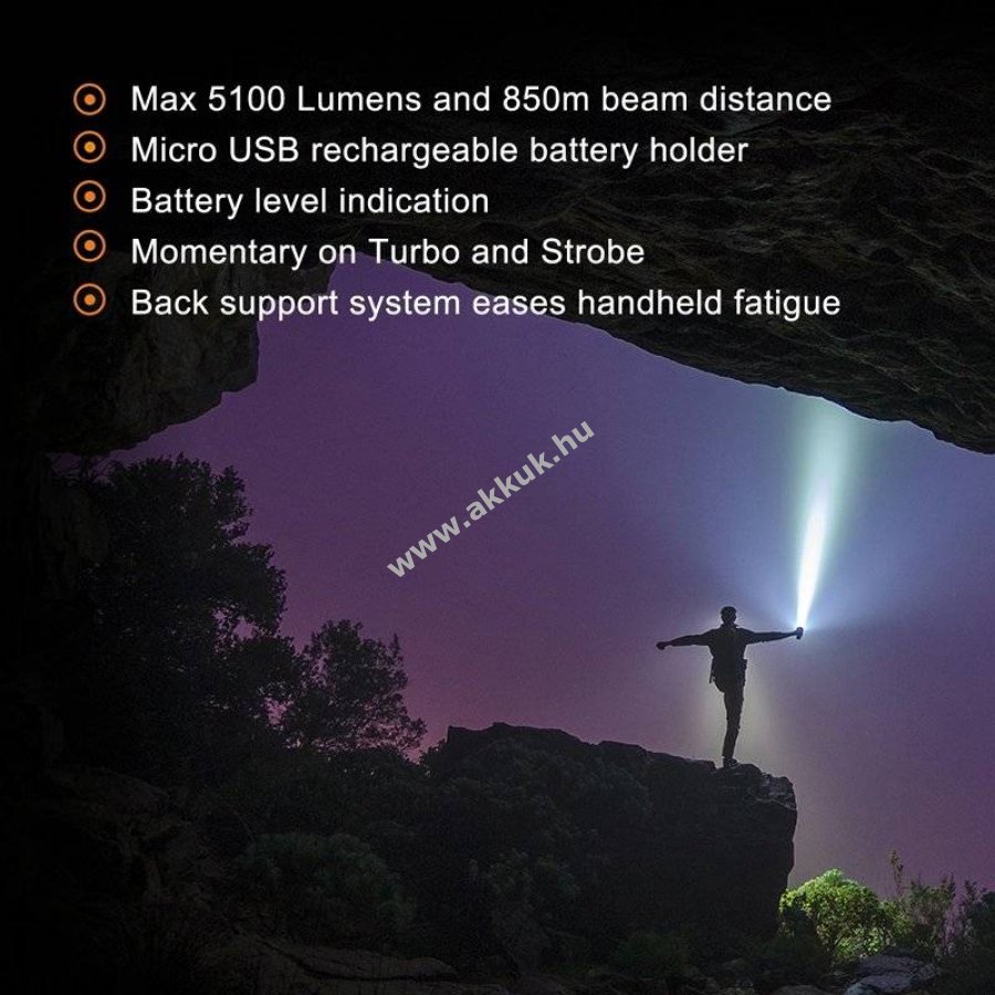- Módok: Burst max.4000lm (összesített üzemidő 1h40min 15min után High módra vált), High 1600lm 3h40min, Medium 600lm 11h20min, Low 35lm 270h, Strobe 4000lm