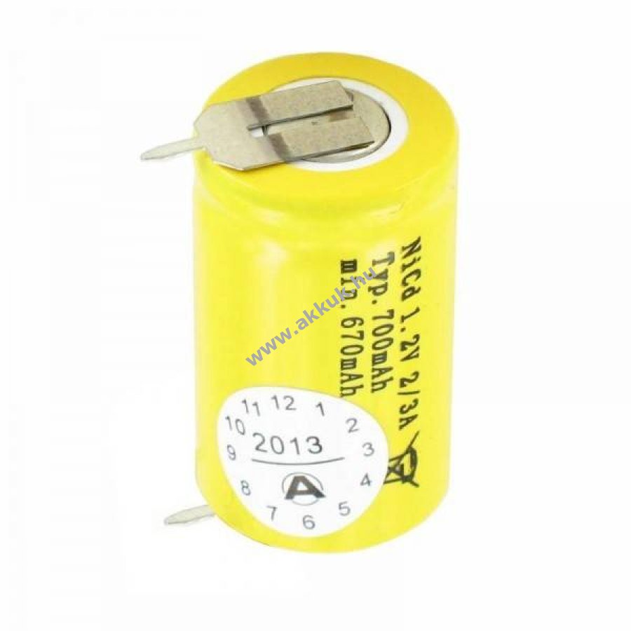Nem eredeti Sanyo KR-600AE 2/3 A méretű NiCd akkucella egyes PRINT csatlakozóval a plusz- és mínusz-pólnál feszültség 1,2V, tipikus kapacitás 670mAh (max. 700mAh). Gyorstölthető és nagyáramú üzemre alkalmas, méretek: magasság 27,8mm, átmérő o16,6mm, tömeg 19gramm.