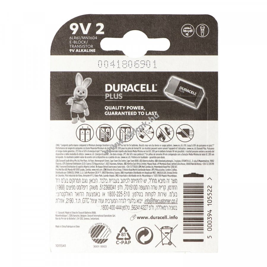 Duracell MN1604 Plus Power 9V alkáli elem, megbízható tápellátás hétköznapi és hordozható készülékekhez.