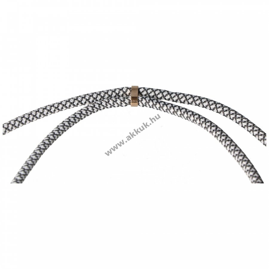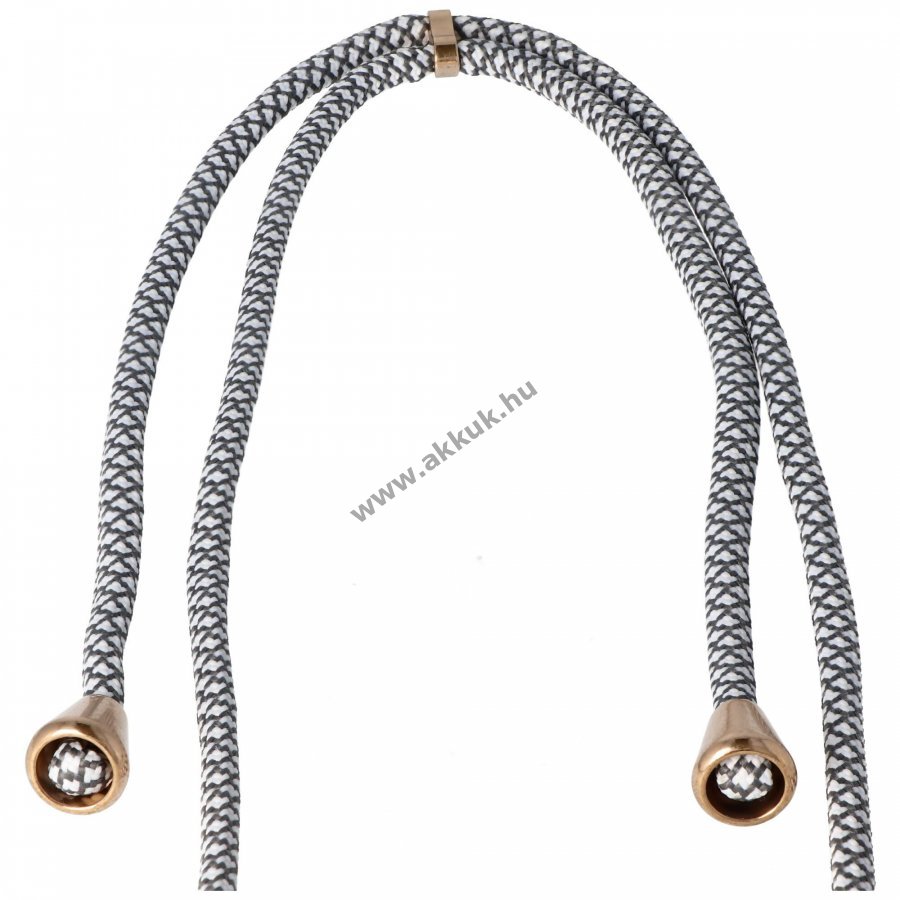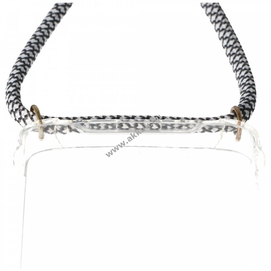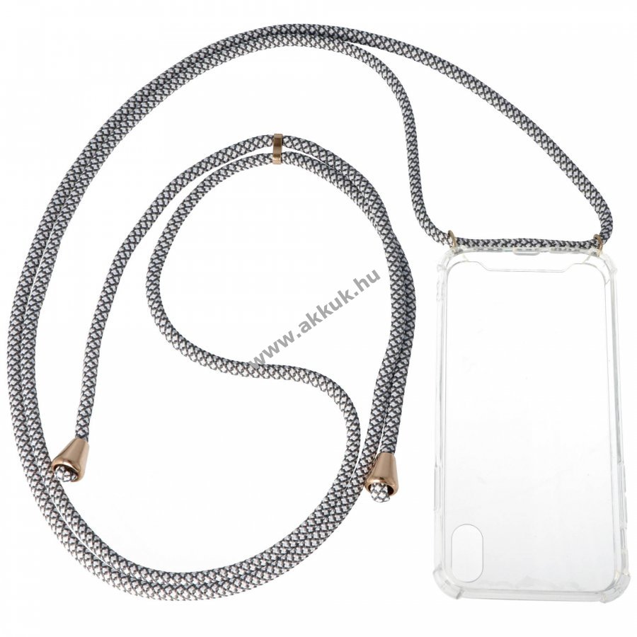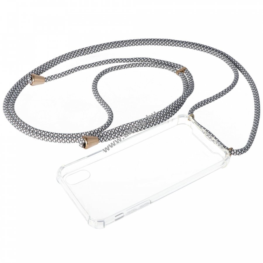 Nyakpántos, átlátszó TPU védőtok kifejezetten az Apple iPhone XR-hez, állítható szürke-fehér zsinórral, védi a készüléket karcoktól és portól.