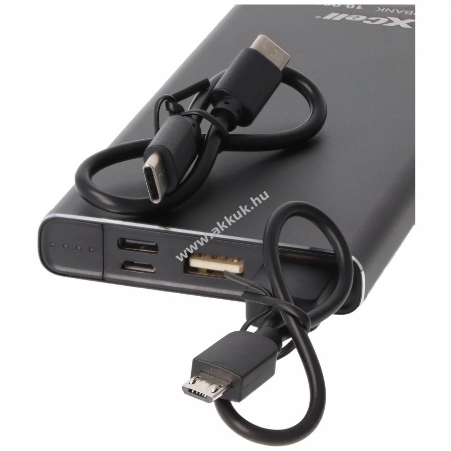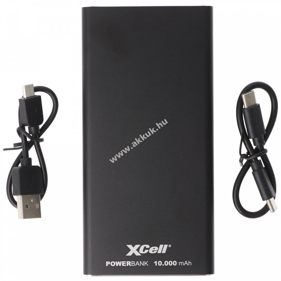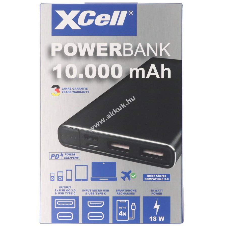 Kompakt fekete minőségi alumíniumházú XCell powerbank 10000mAh (37Wh), gyors töltés támogatással USB Type-C (PD) és 2xQC3.0 kimenettel.