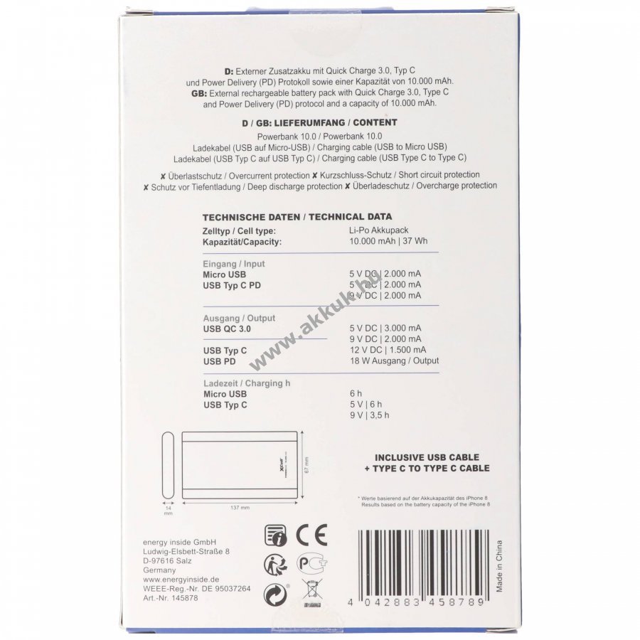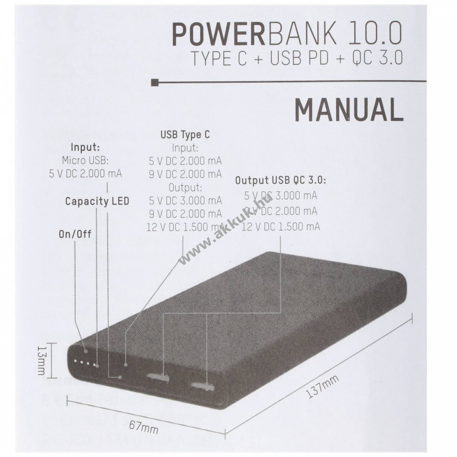 - Csomag tartalma: Powerbank, USB-C-USB-C kábel, USB-Micro-USB kábel, használati útmutató