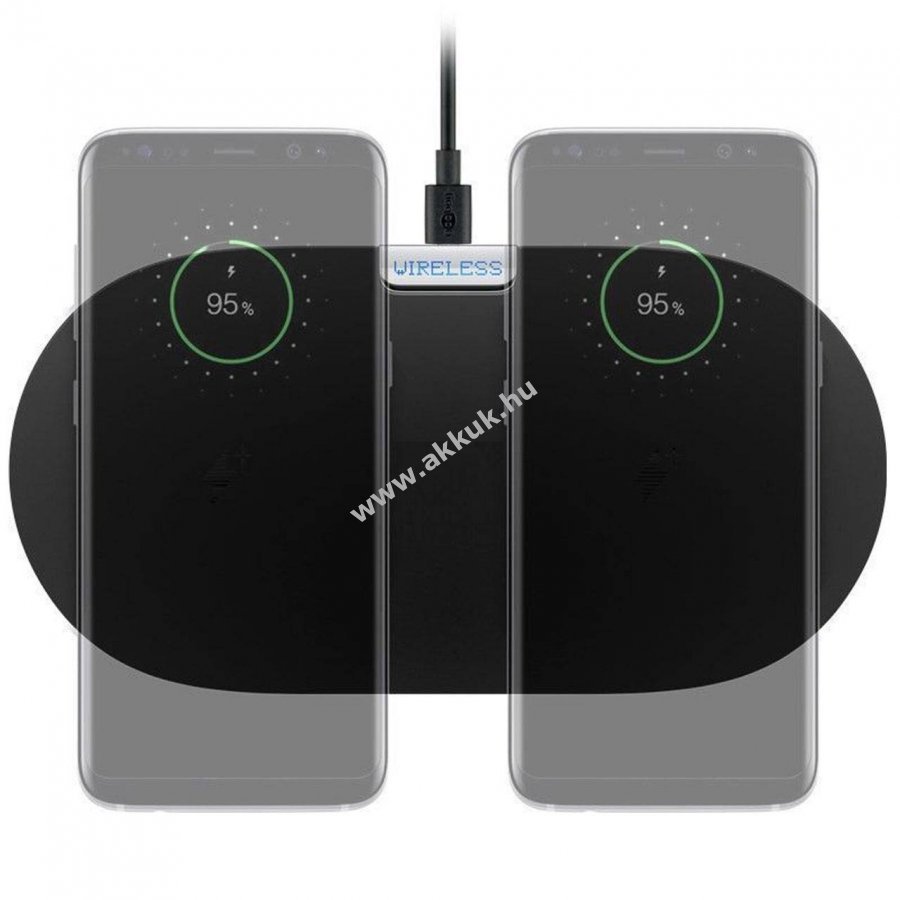 Vezeték nélküli Qi dupla gyors töltőpad, amely egyszerre két Qi kompatibilis eszközt tölt indukciós technológiával.