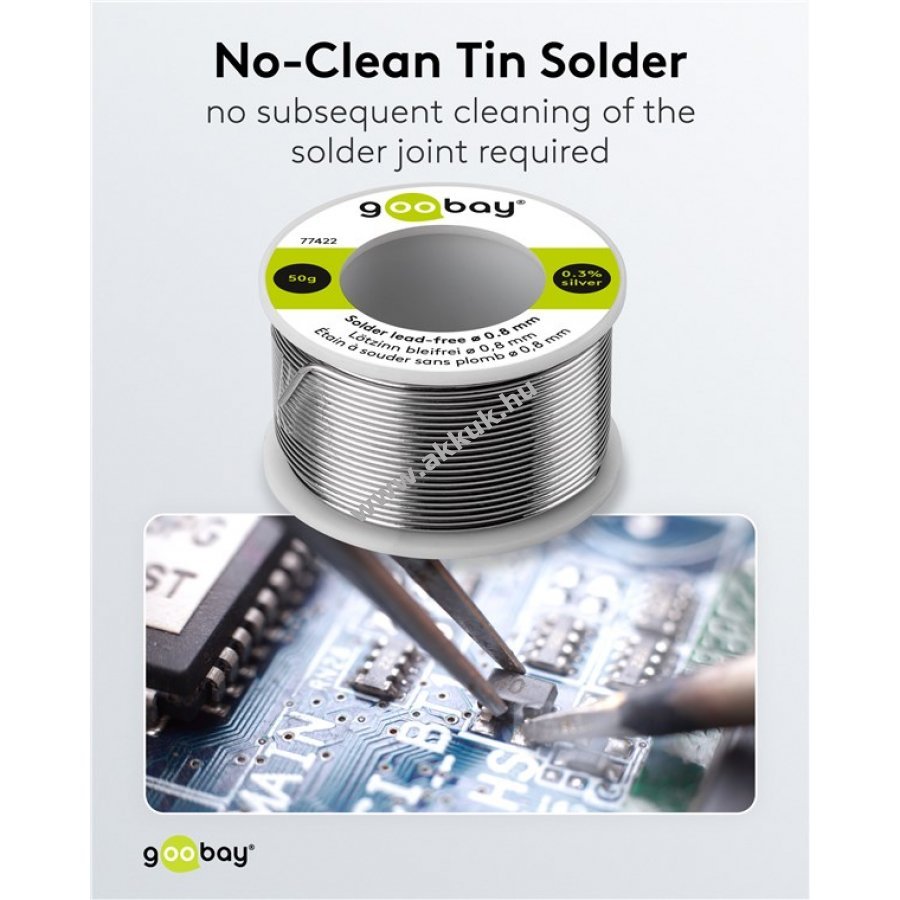 Vékony, könnyen adagolható ólommentes forraszanyag 0,8mm átmérővel, 50g kiszerelésben, ideális precíziós elektronikai forrasztáshoz, például nyákokhoz, SMD- és DIP-alkatrészekhez, kábelekhez, televíziókhoz, fejhallgatókhoz és mikrofonokhoz.