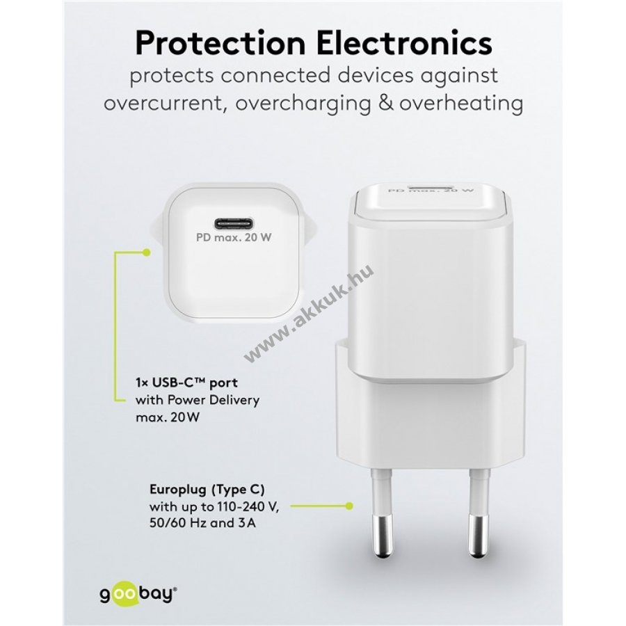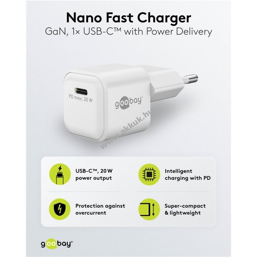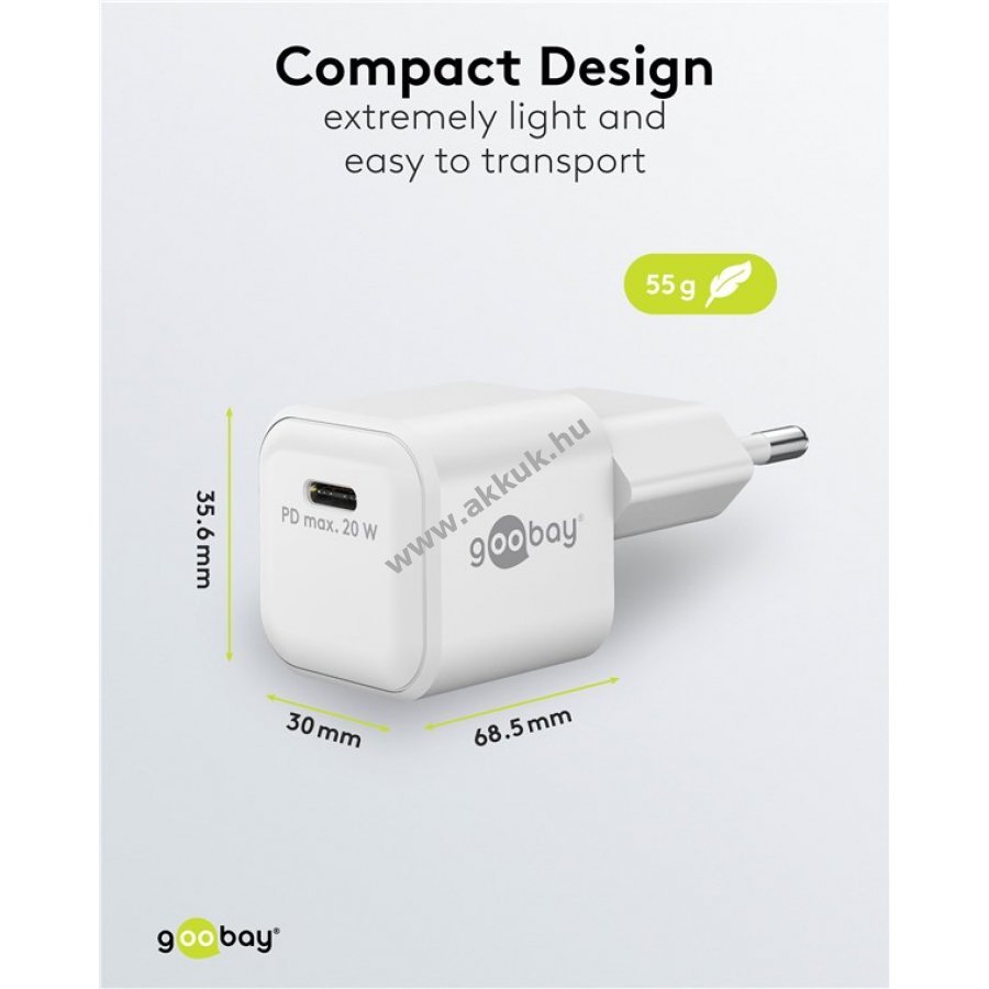 Kompakt és könnyű gyorstöltő otthoni és utazási használatra gyors és megbízható töltést biztosít okostelefonokhoz és táblagépekhez 30 perc alatt 50% töltöttség a gyors töltési módnak köszönhetően akár négyszer gyorsabb a hagyományos töltőknél 20W teljesítmény ideális kisebb eszközökhöz mint okostelefonok Bluetooth fülhallgatók táblagépek vagy powerbankok GaN félvezető technológia gyorsabb hatékonyabb töltést és kompakt kialakítást tesz lehetővé Power Delivery technológia biztonságos és dinamikus töltés az eszköz optimális teljesítményével USB-C csatlakozó univerzális és hosszú távú kompatibilitás Apple iPhone Samsung Xiaomi LG Huawei és más márkák támogatása beépített védelem túlfeszültség túltöltés és túlmelegedés ellen